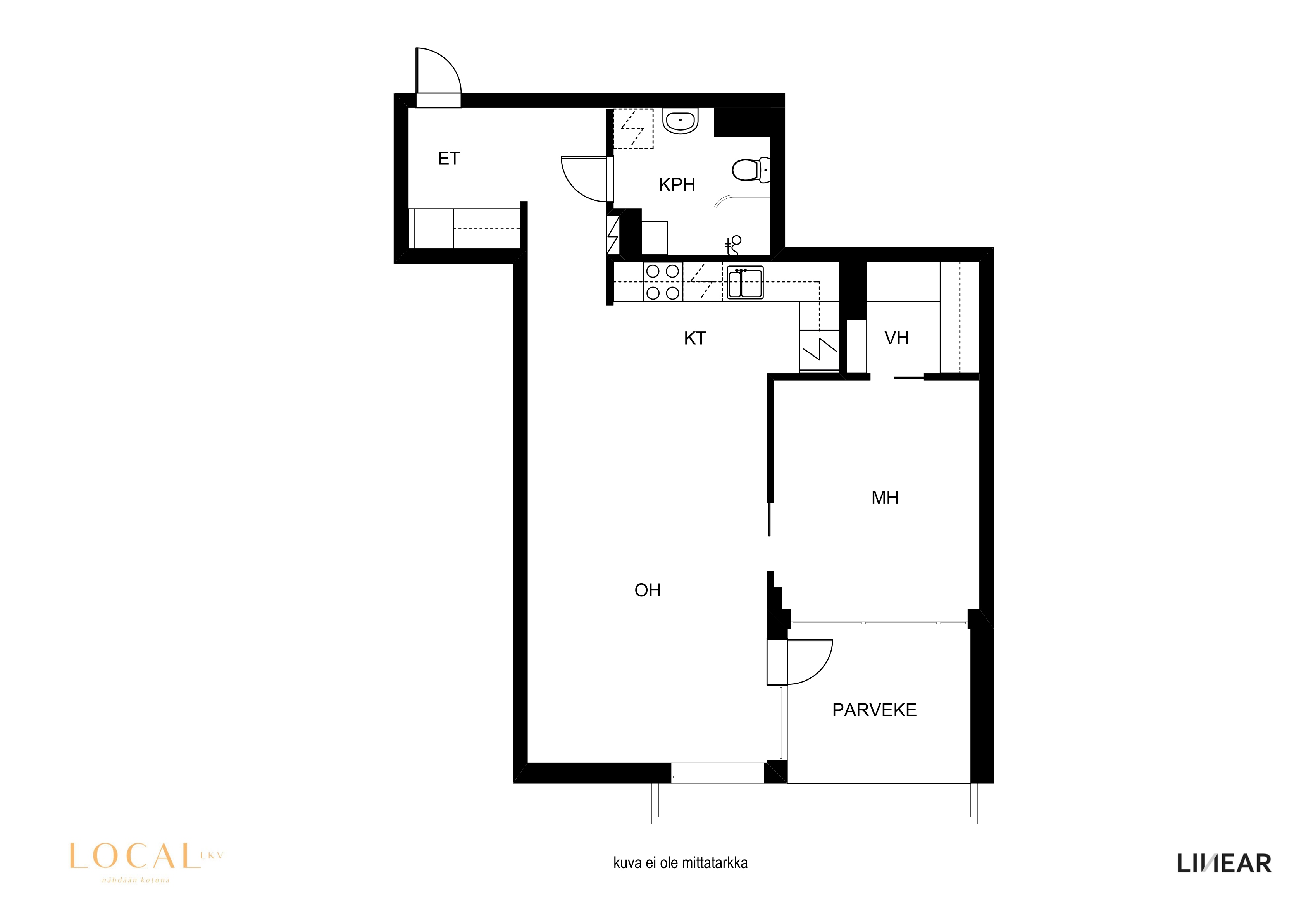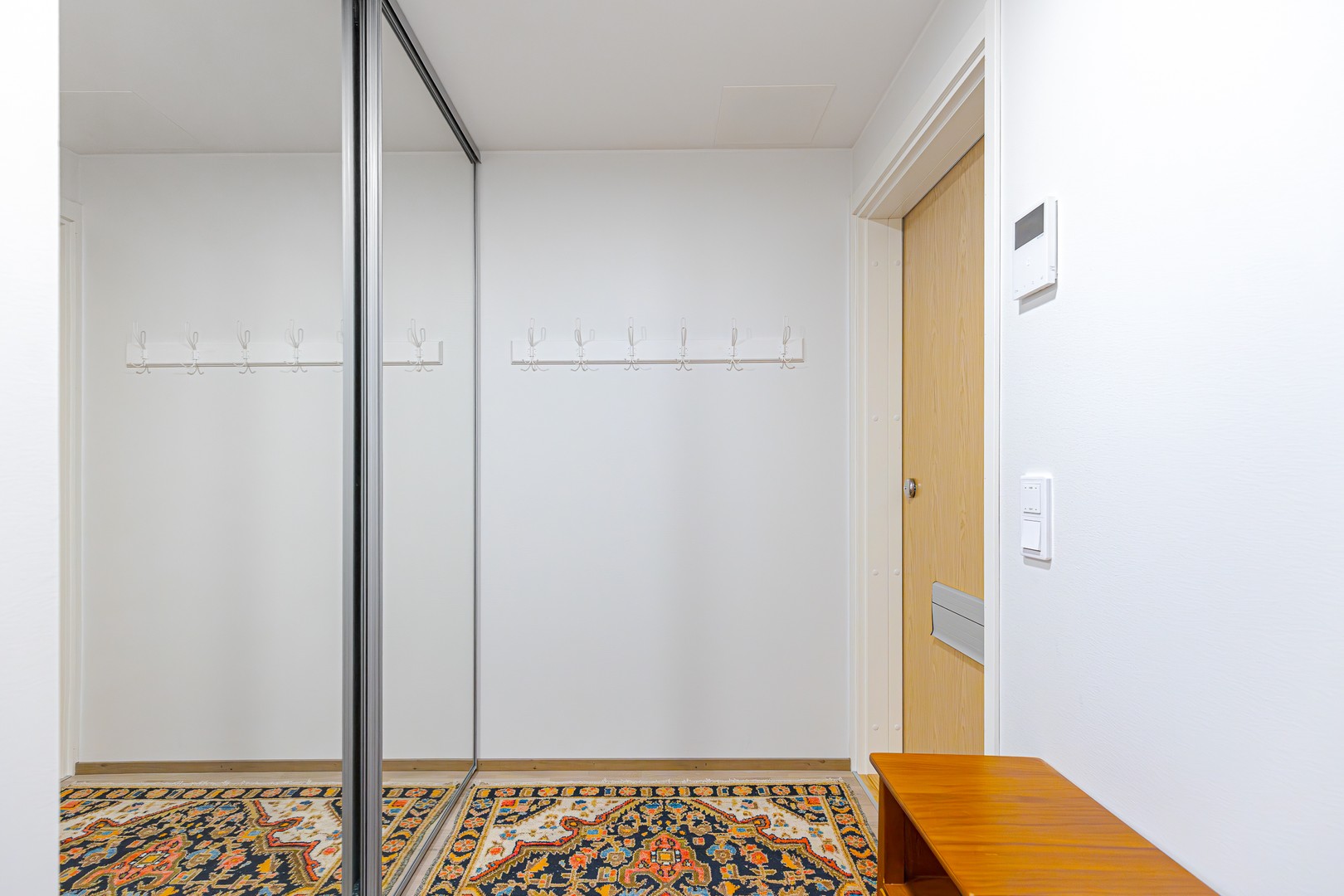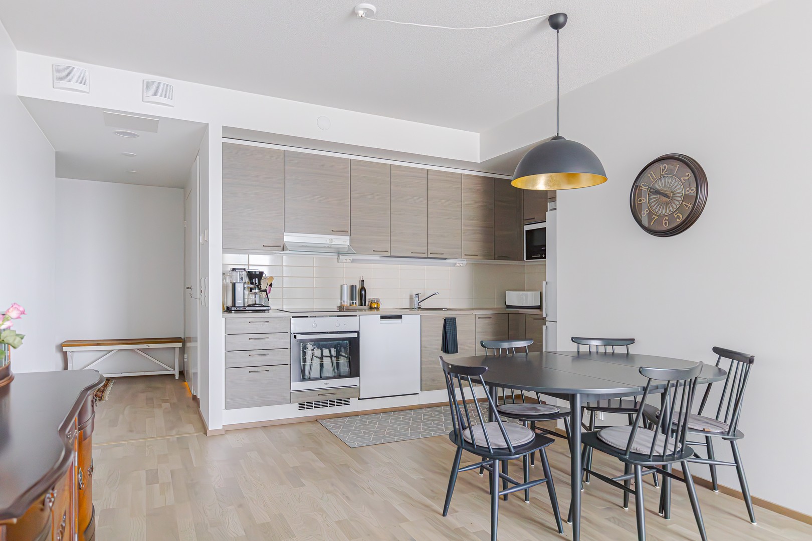 Avokeittiö sointuu luontevasti yhteen olohuoneen kanssa. Keittiön yhteyteen saat helposti ruokapöydän ja avarasta oleskelutilasta on käynti lasitetulle parvekkeelle. Lattiaan asti ulottuvaa Ikkunapinta-alaa on reilusti ja valoa tulvii runsaasti koko asuntoon. Eteisen yhteydessä on myös kaapistot sekä käynti tilavaan kylpyhuoneeseen. Säilytystilaa löytyy riittävästi, sillä makuuhuoneen yhteyteen on suunniteltu vaatehuone. Lisäksi häkkivarasto sijaitsee samassa kerroksessa.