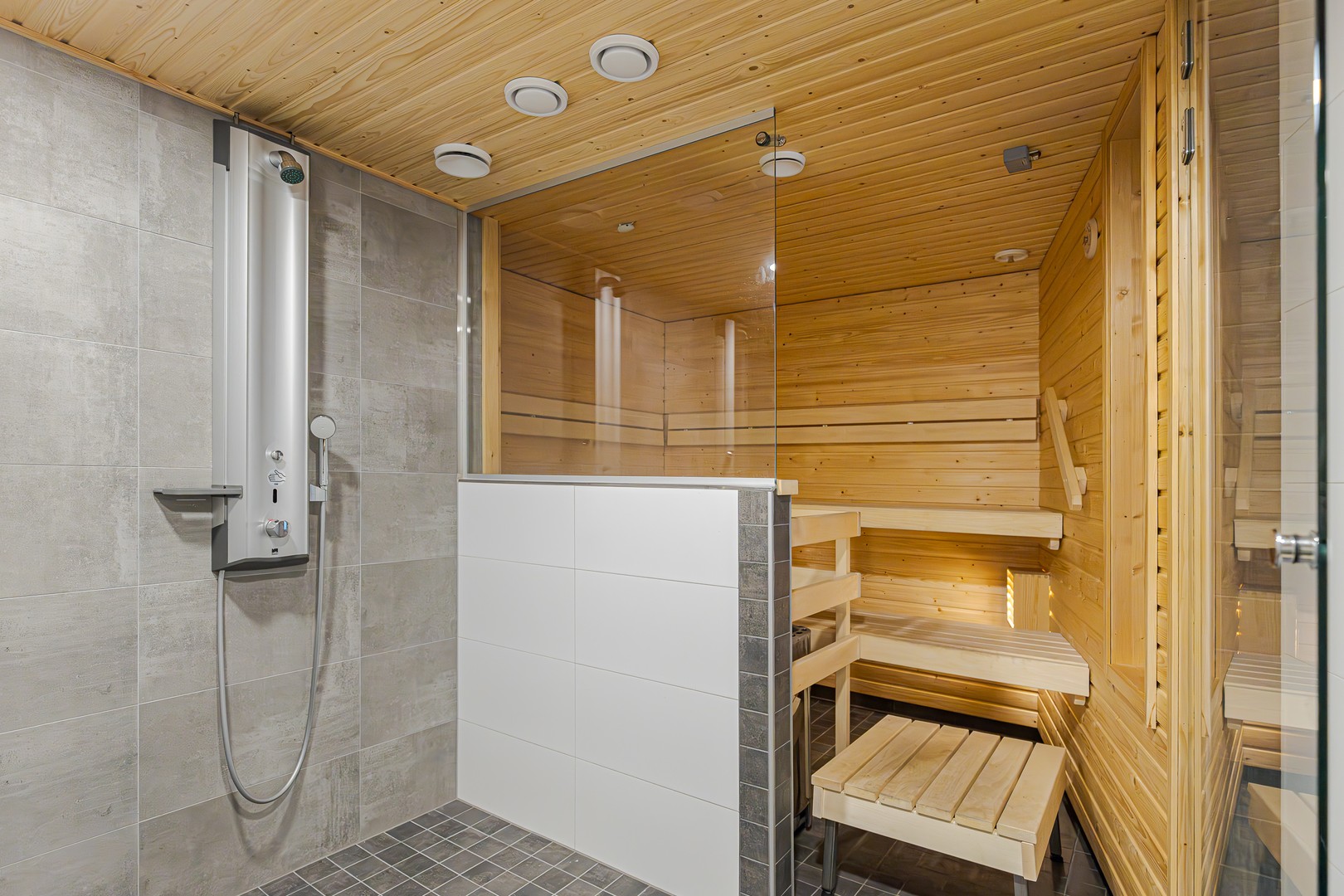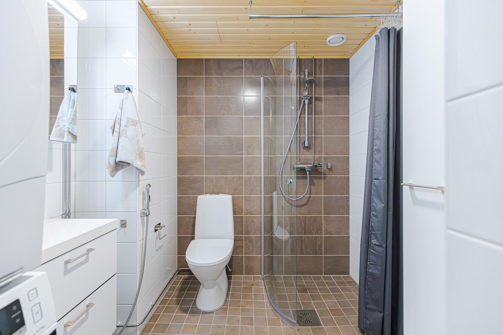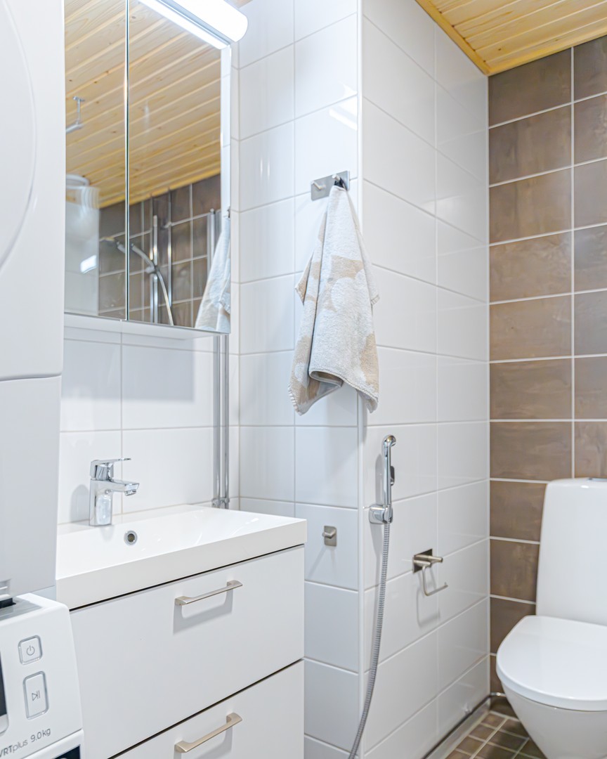 WC-istuin, suihku, suihkuseinä, pesukoneliitäntä, lattialämmitys, peilikaappi, pesuallas, bidee-suihku ja allaskaappi