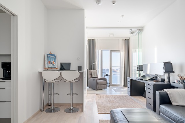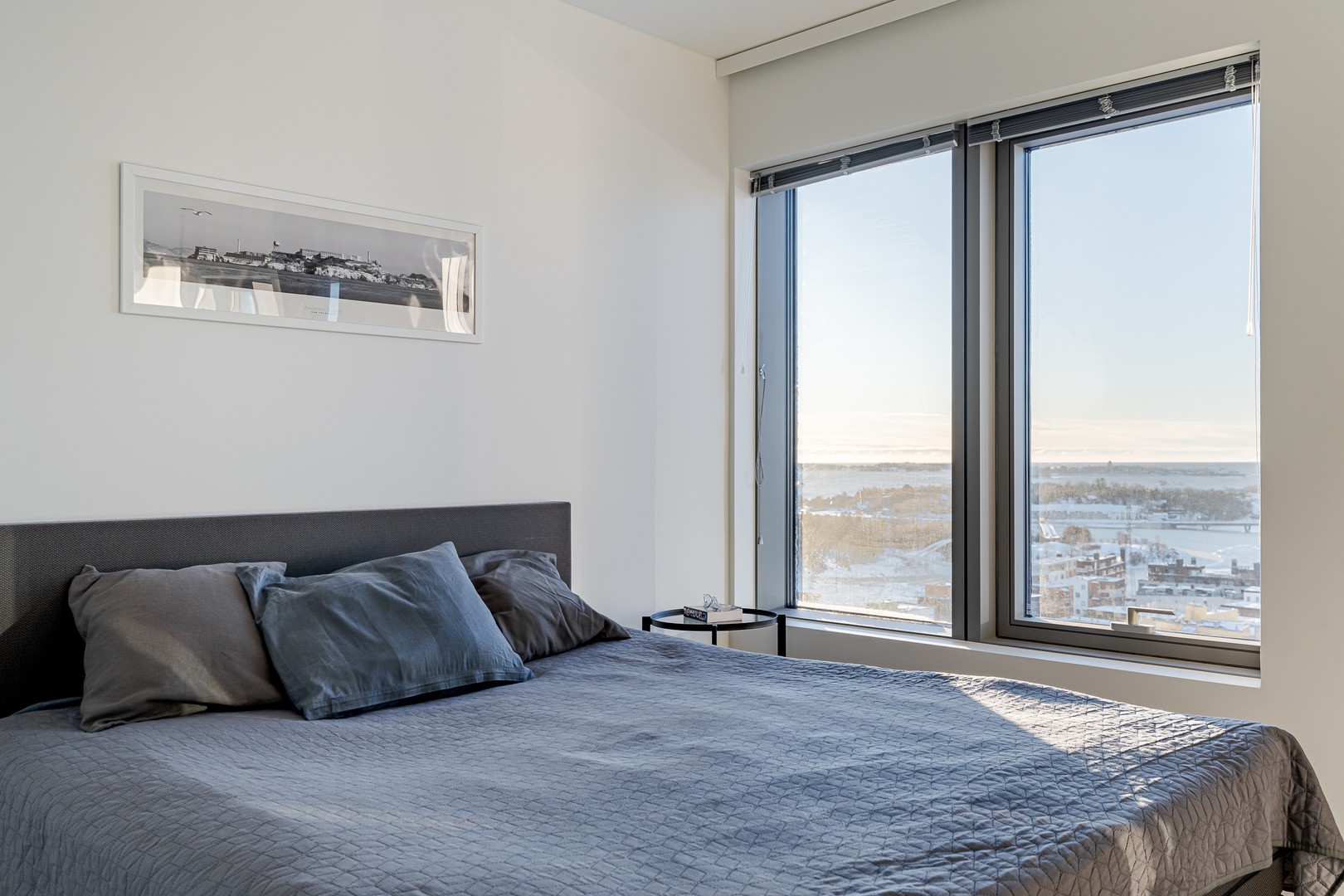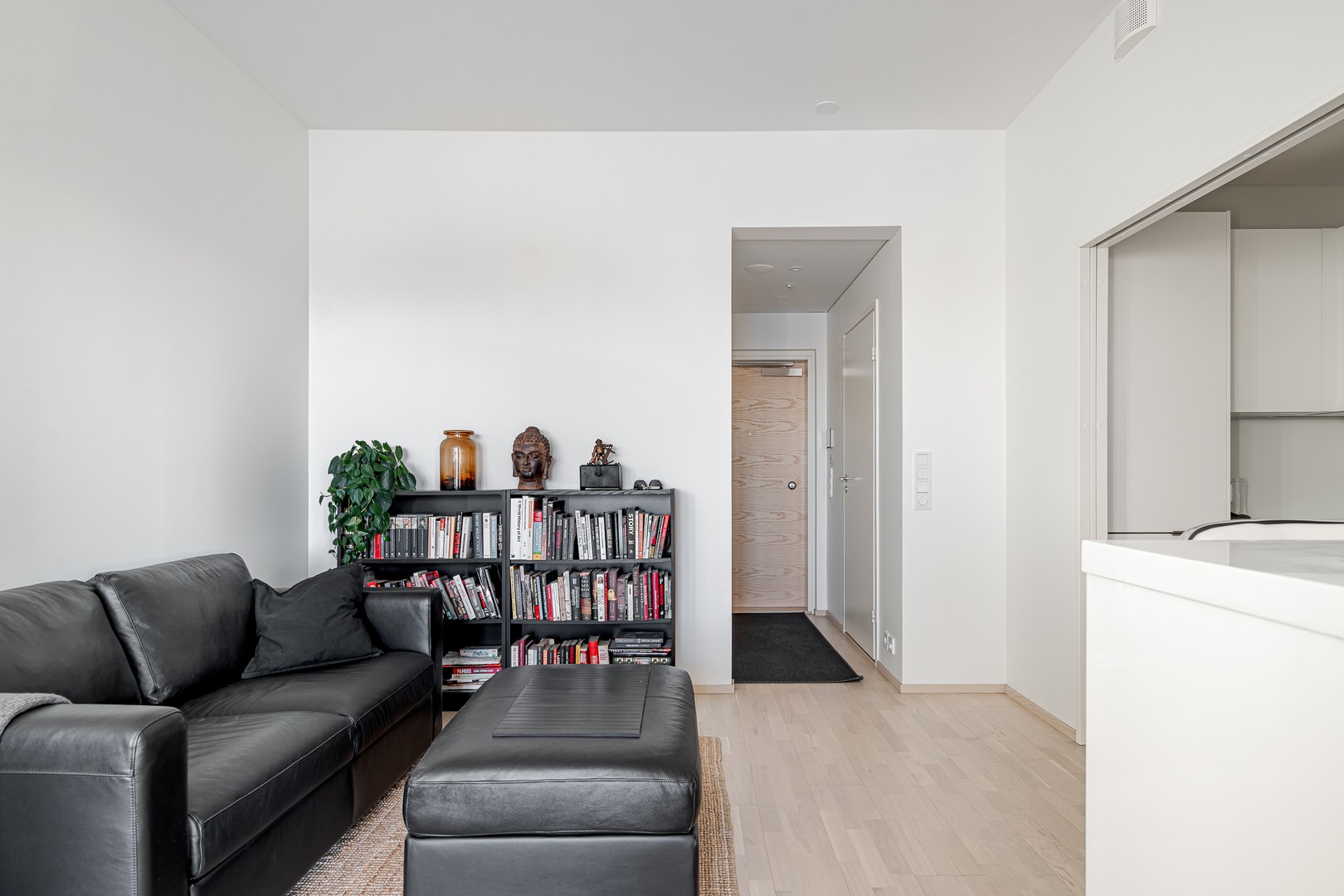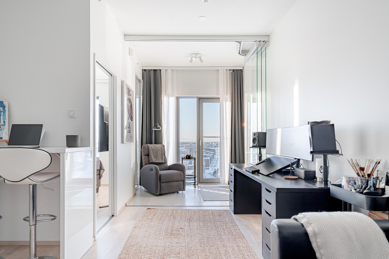 Tämä koti on erityisen valoisa, avara ja ikkunapinta-alaa on runsaasti. Valtavista ikkunoista on pysäyttävät näkymät, jotka on nähtävä paikanpäällä! Avokeittiöön on valittu vaaleat ajattomat kaapistot, jotka tuovat tyylikkyyttä asuntoon. Oleskelutilaan saat helposti sohvan ja tilaa riittää myös pienelle ruokapöydälle. Kylpyhuone on tilava ja pesukoneellekin löytyy tilaa. Asunnossa sijaitsevat kiinteät kaapistot makuuhuoneessa sekä eteisessä takaavat kattavat säilytystilat.