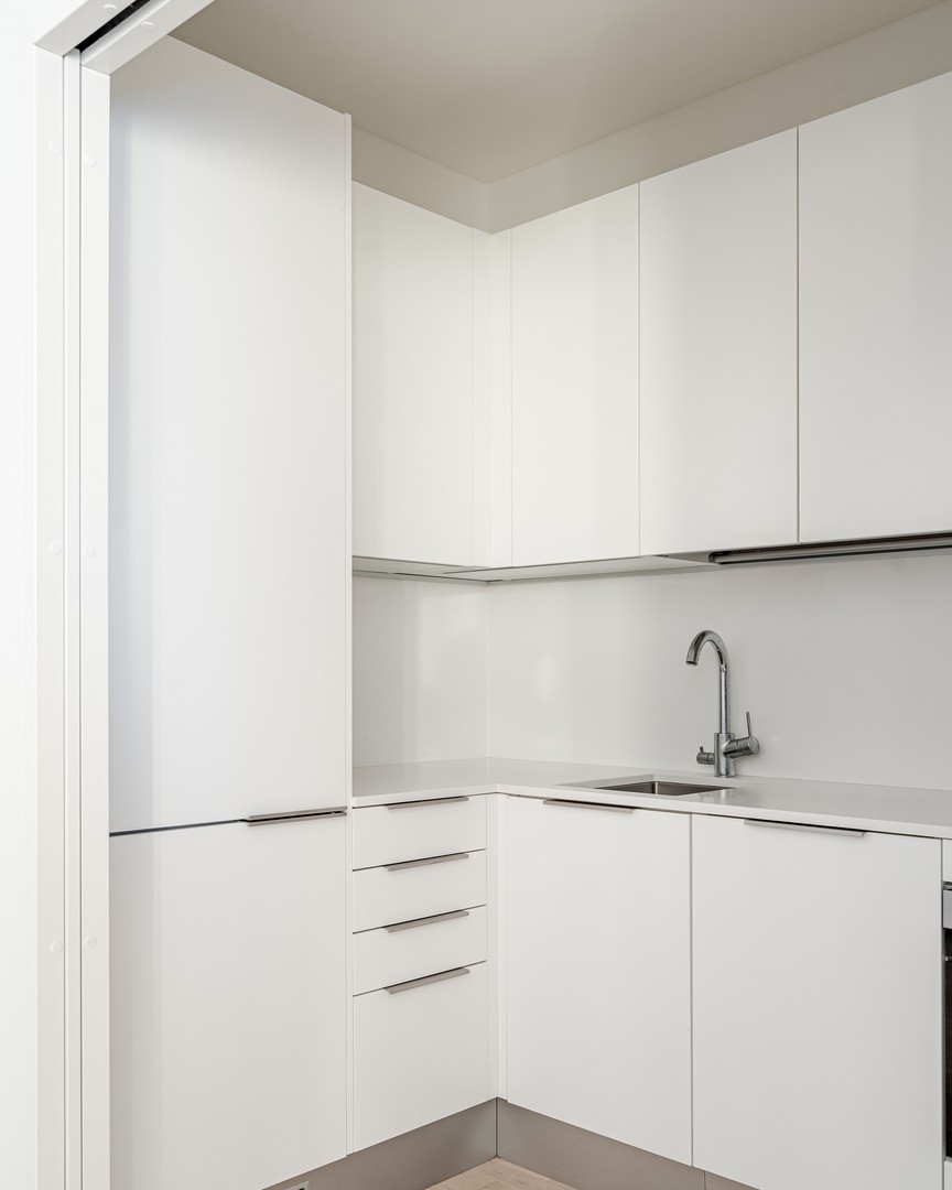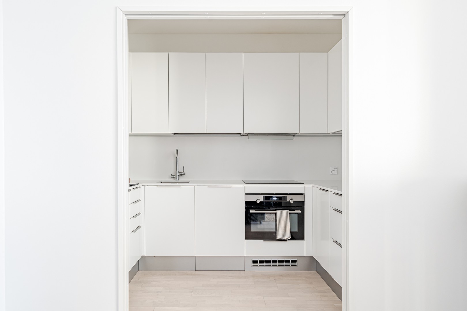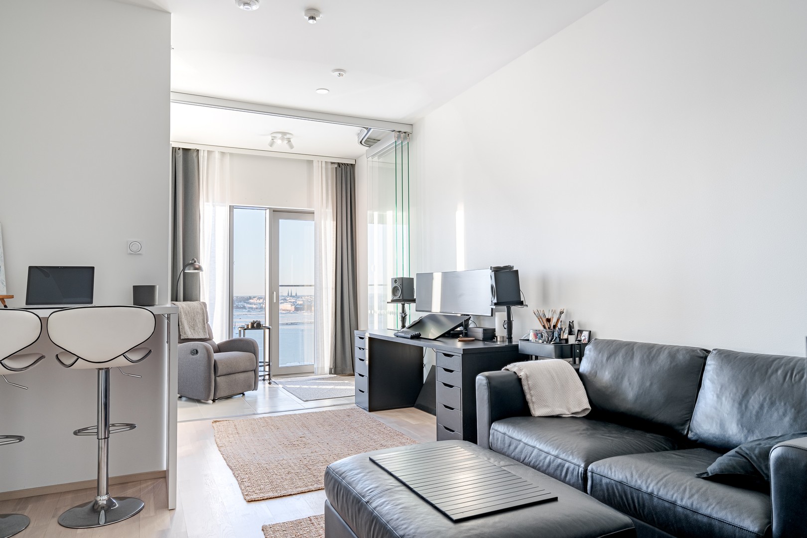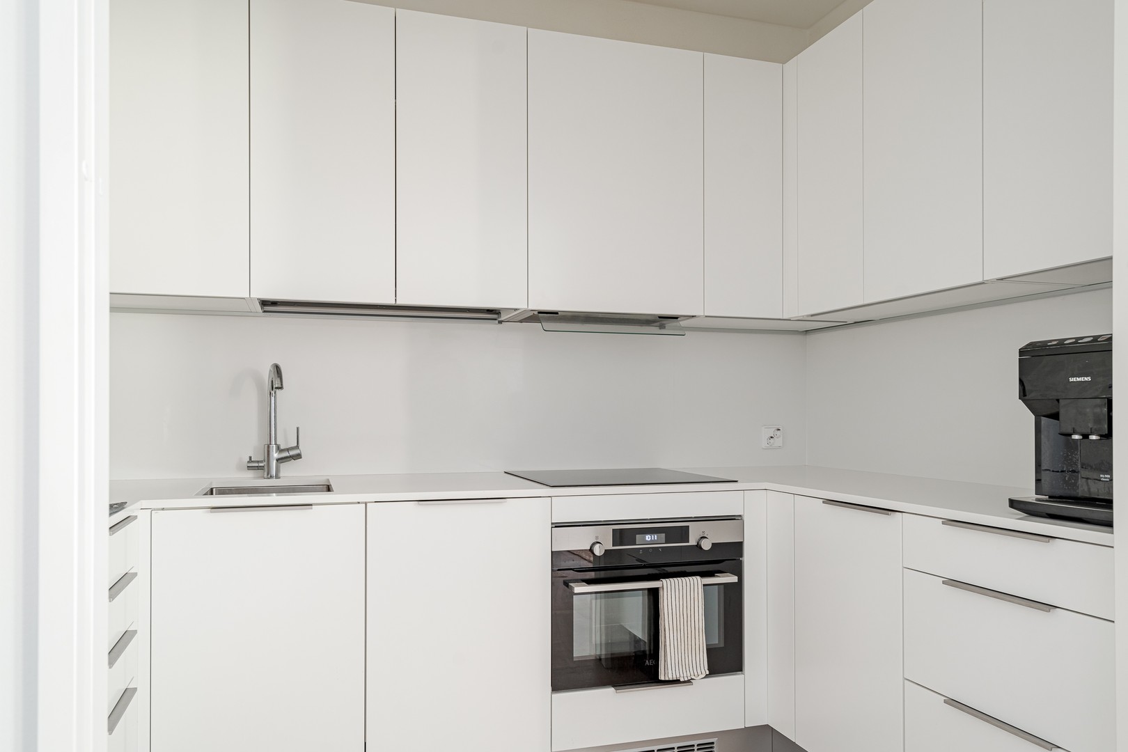 Tämä koti on erityisen valoisa, avara ja ikkunapinta-alaa on runsaasti. Valtavista ikkunoista on pysäyttävät näkymät, jotka on nähtävä paikanpäällä! Avokeittiöön on valittu vaaleat ajattomat kaapistot, jotka tuovat tyylikkyyttä asuntoon. Oleskelutilaan saat helposti sohvan ja tilaa riittää myös pienelle ruokapöydälle. Kylpyhuone on tilava ja pesukoneellekin löytyy tilaa. Asunnossa sijaitsevat kiinteät kaapistot makuuhuoneessa sekä eteisessä takaavat kattavat säilytystilat.