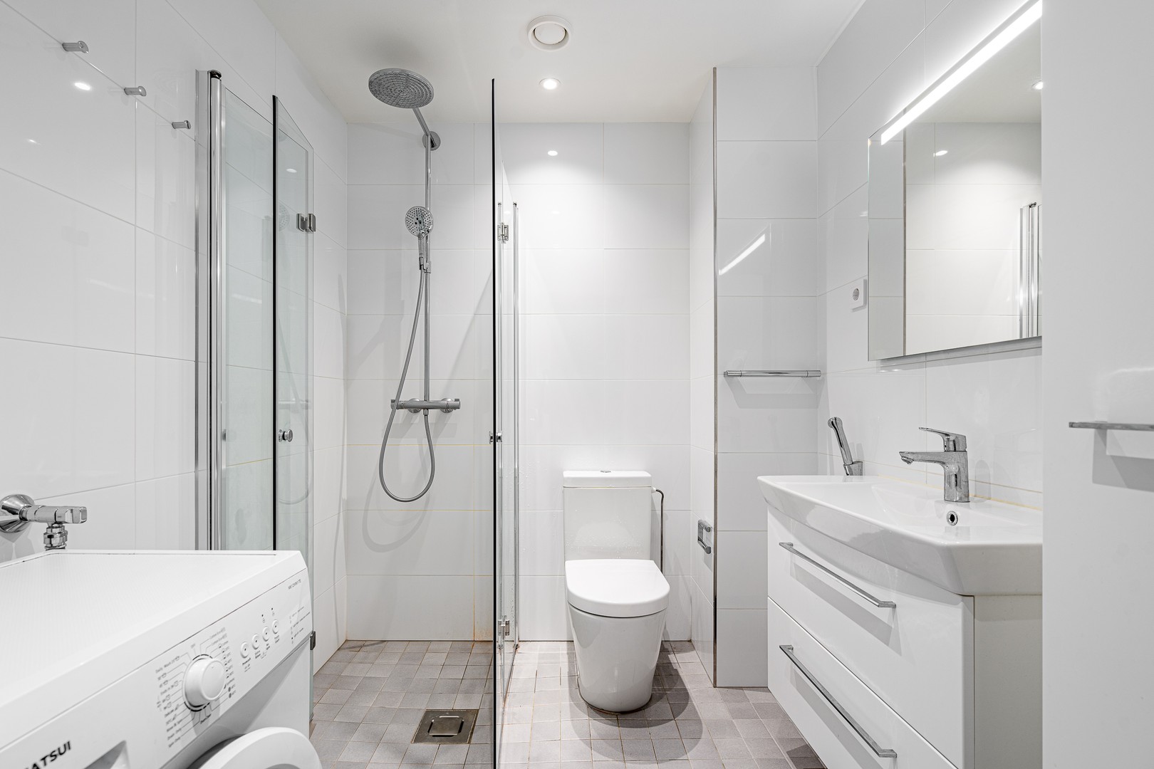 wc-istuin, suihkuseinä, suihku, pesukoneliitäntä, peili, allaskaappi ja Lattialämmitys..