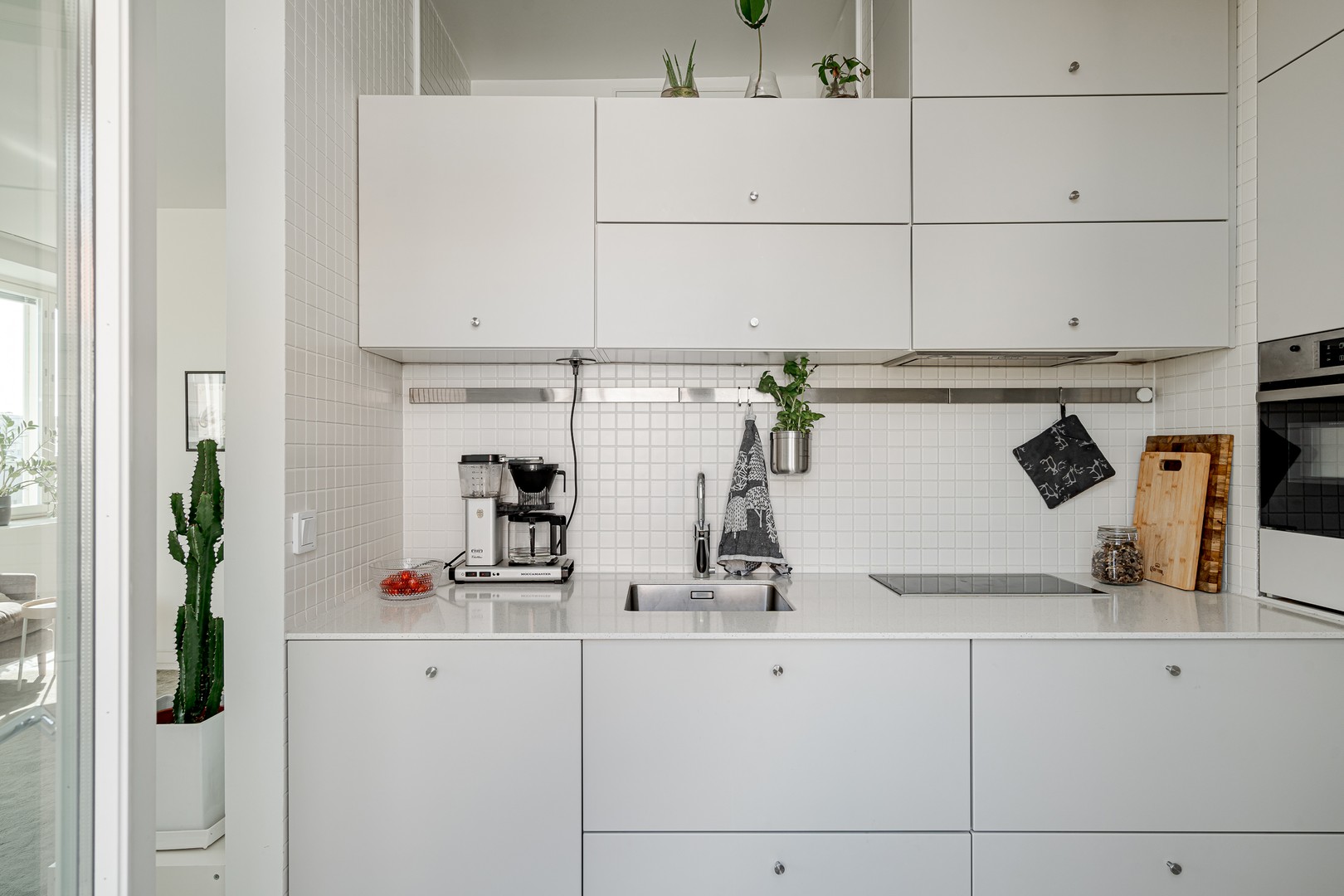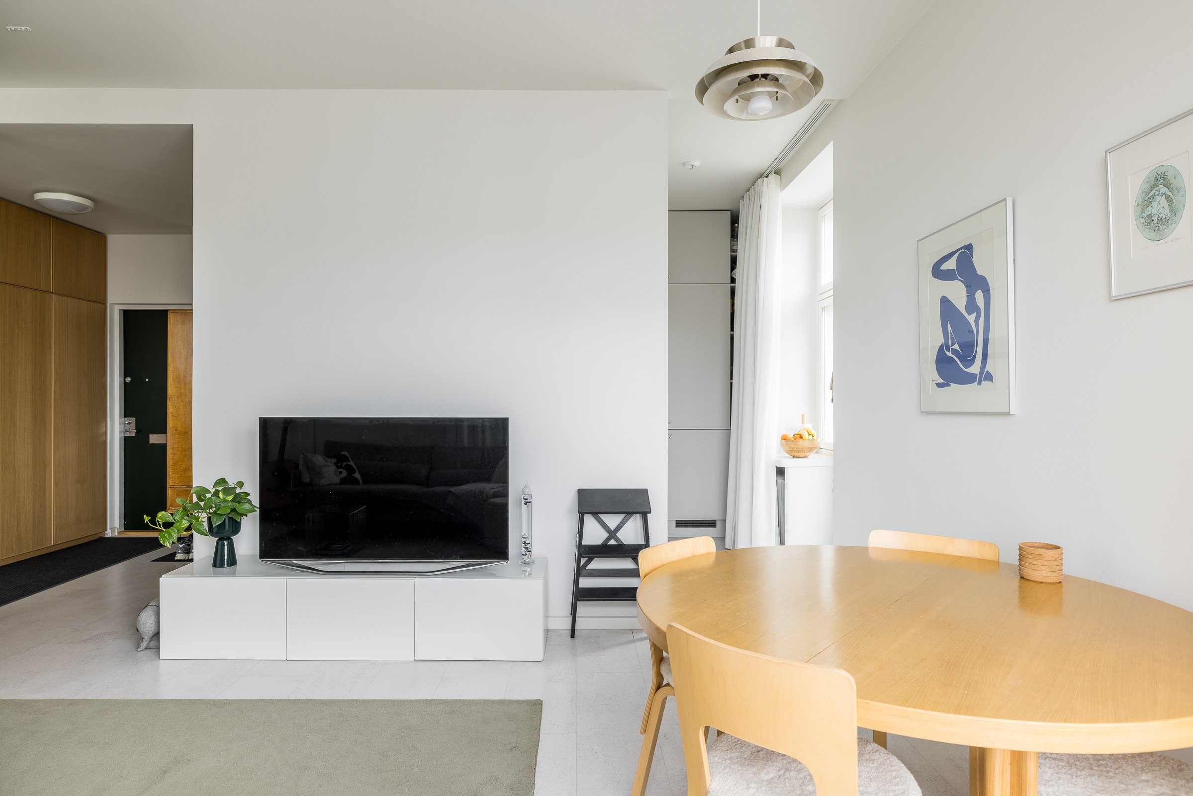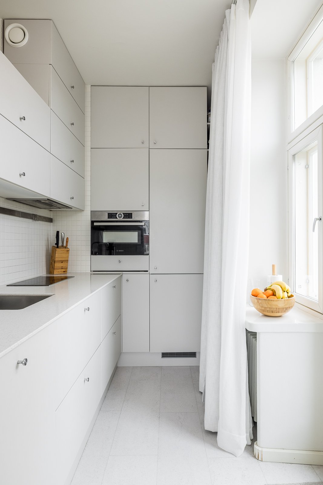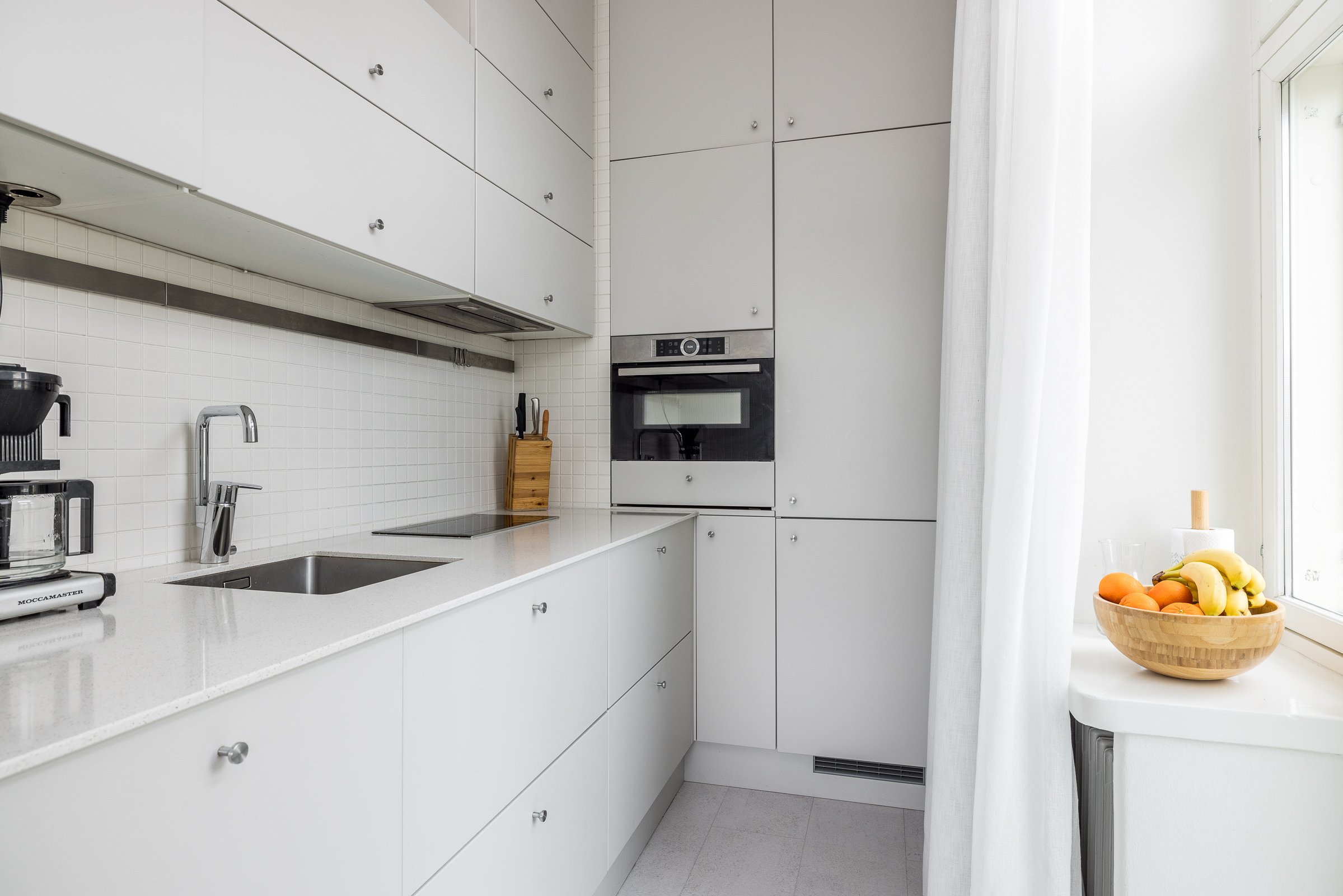 Keittiö tarjoaa runsaasti säilytystilaa ja mahdollistaa kahden ihmisen yhtäaikaisen ruuanlaiton. Kaapistot (KVIK) ovat normaalia syvempiä, taso upeaa kivikomposiittia ja kodinkoneet laadukkaita (Bosch). Huoneiston kulmassa sijaitsee asunnon sydämenä toimiva olohuone, joka toimii yhteytenä asunnon muihin tiloihin. Olohuoneeseen mahtuu hyvin sohva ja ruokailuryhmä.
