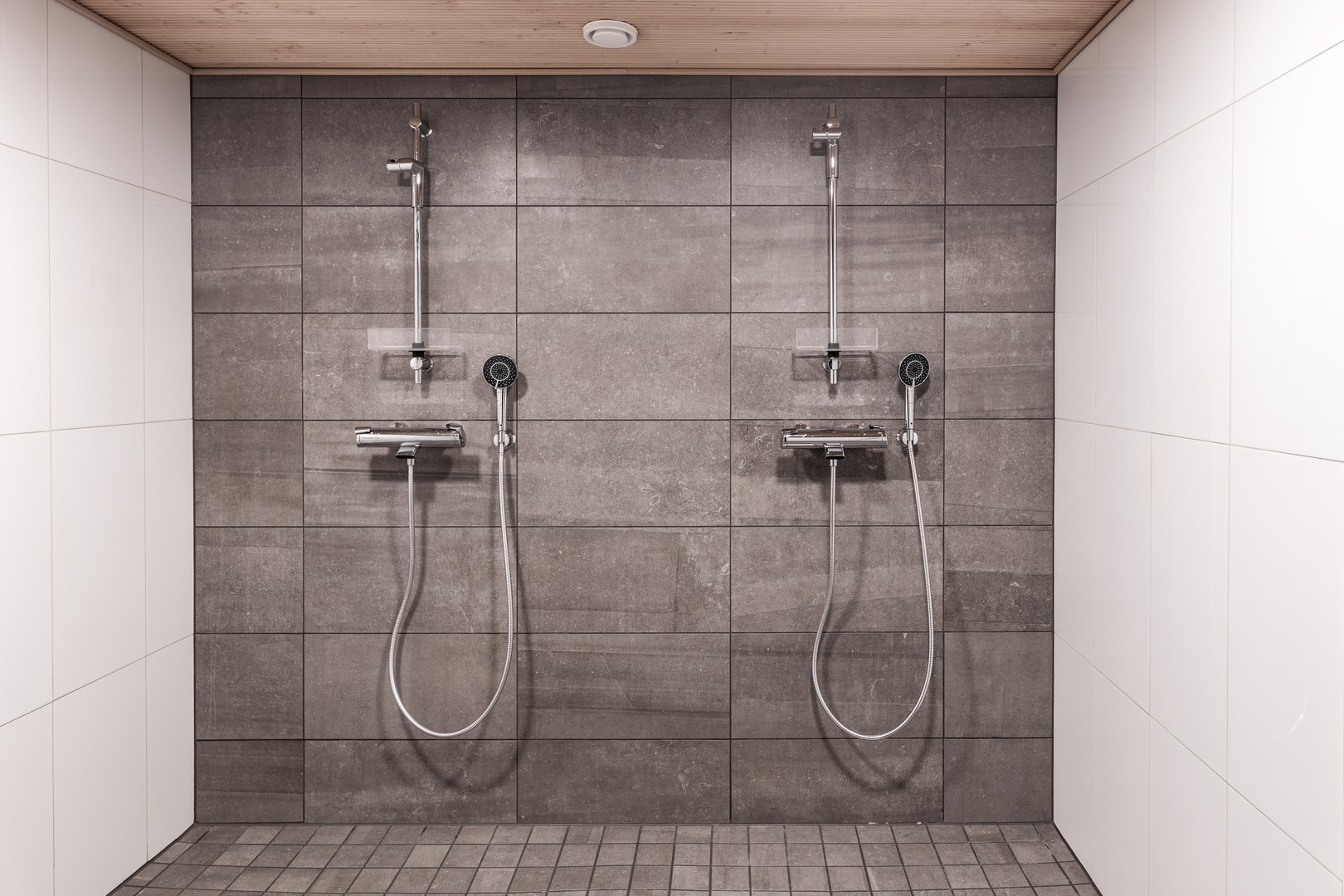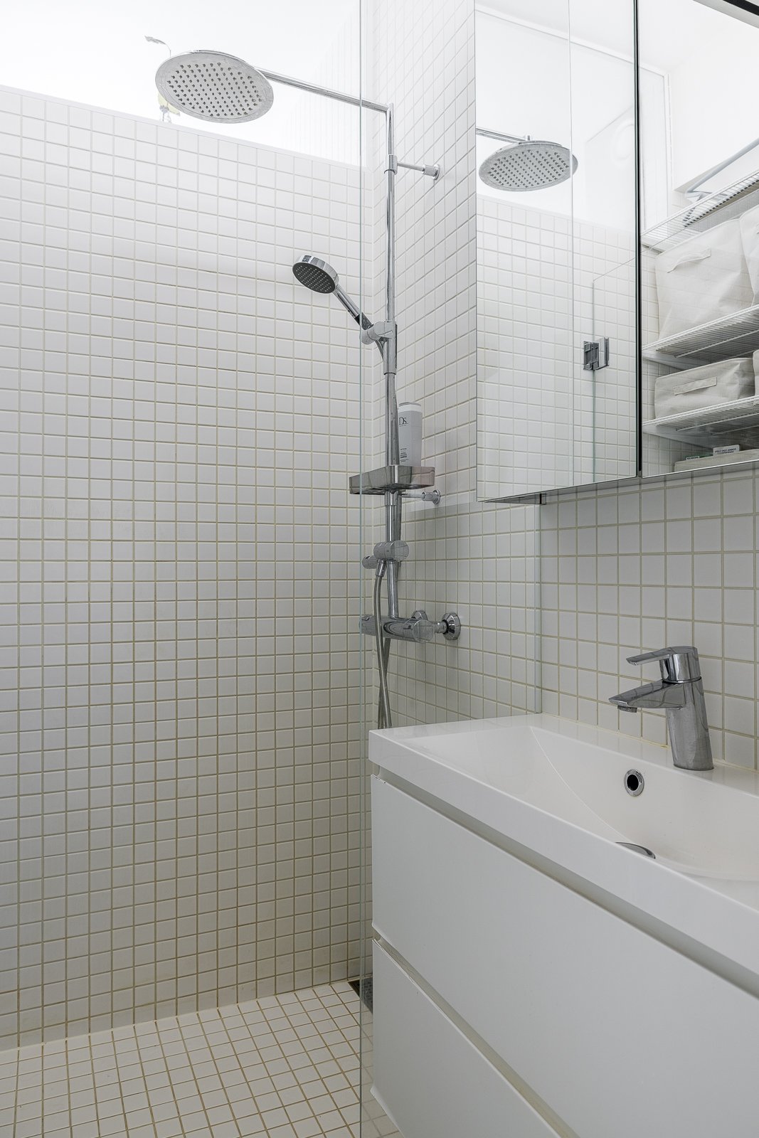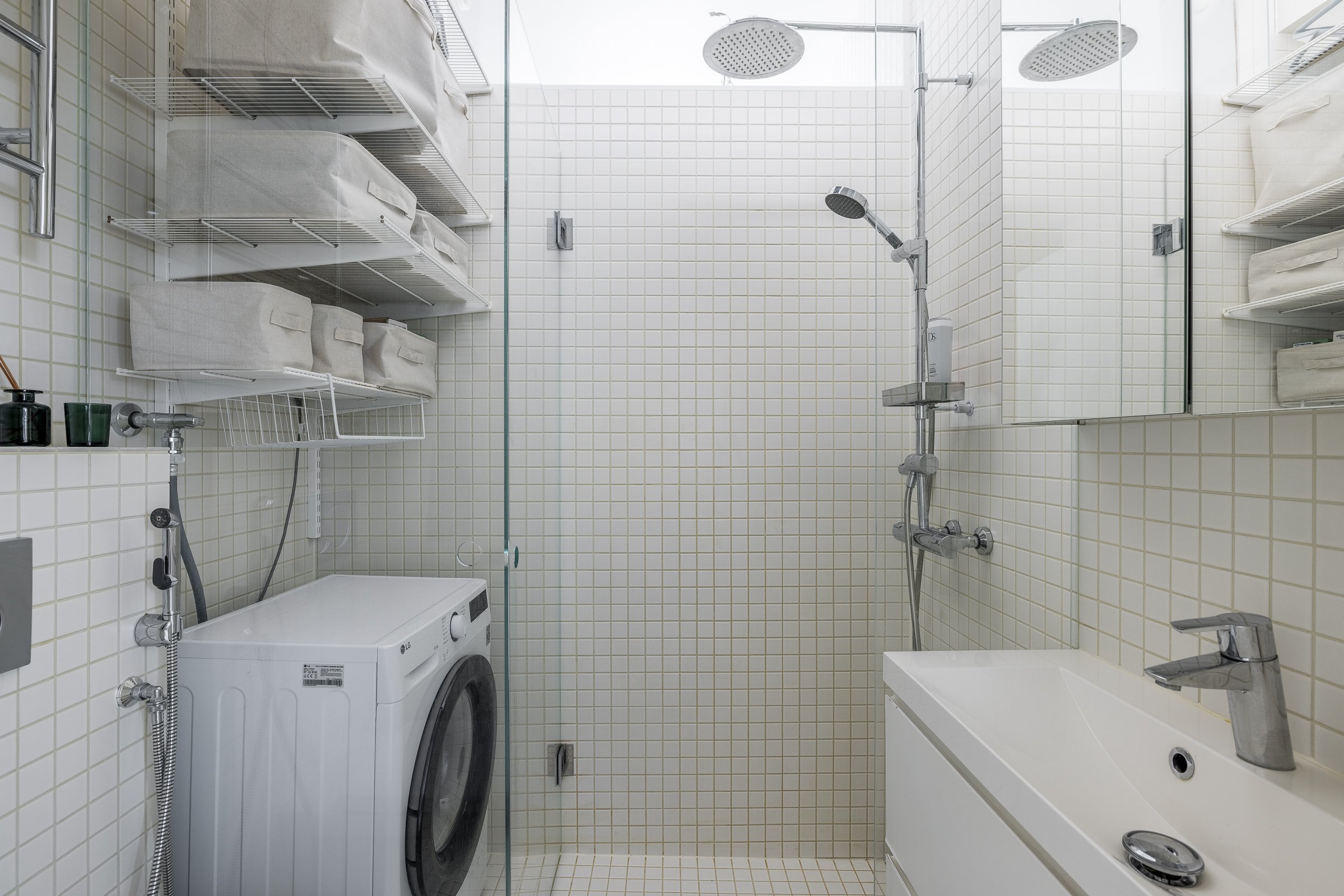 Kylpyhuone on suunniteltu kahden ihmisen yhtäaikaista käyttöä varten jakamalla tila näyttävällä lasiseinällä kahtia. Suihkun yläikkunasta siroava aamuaurinko on yksi asunnon lukuisista yksityiskohdista. Lisäksi asumismukavuutta lisää kylpyhuoneen lattialämmitys.