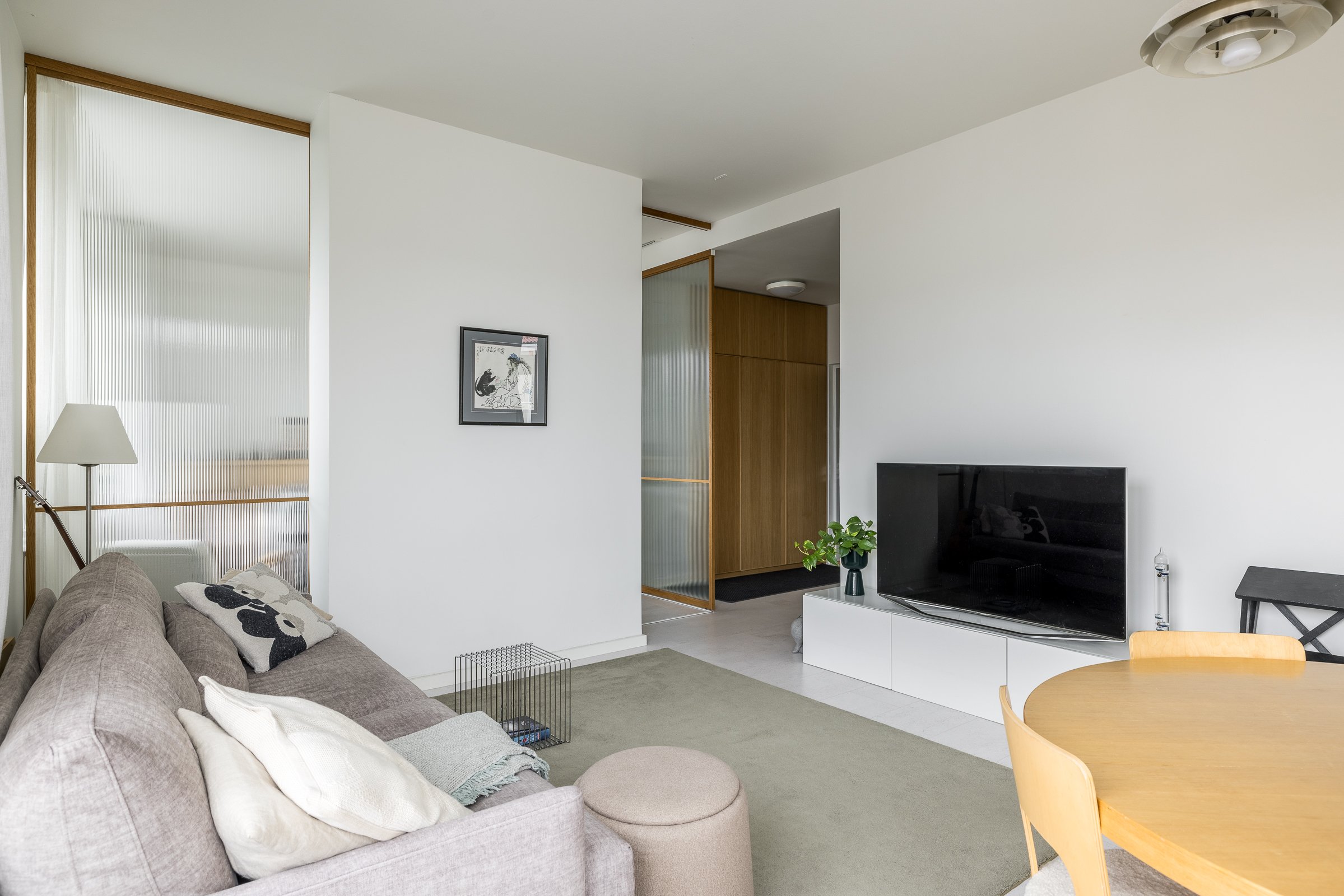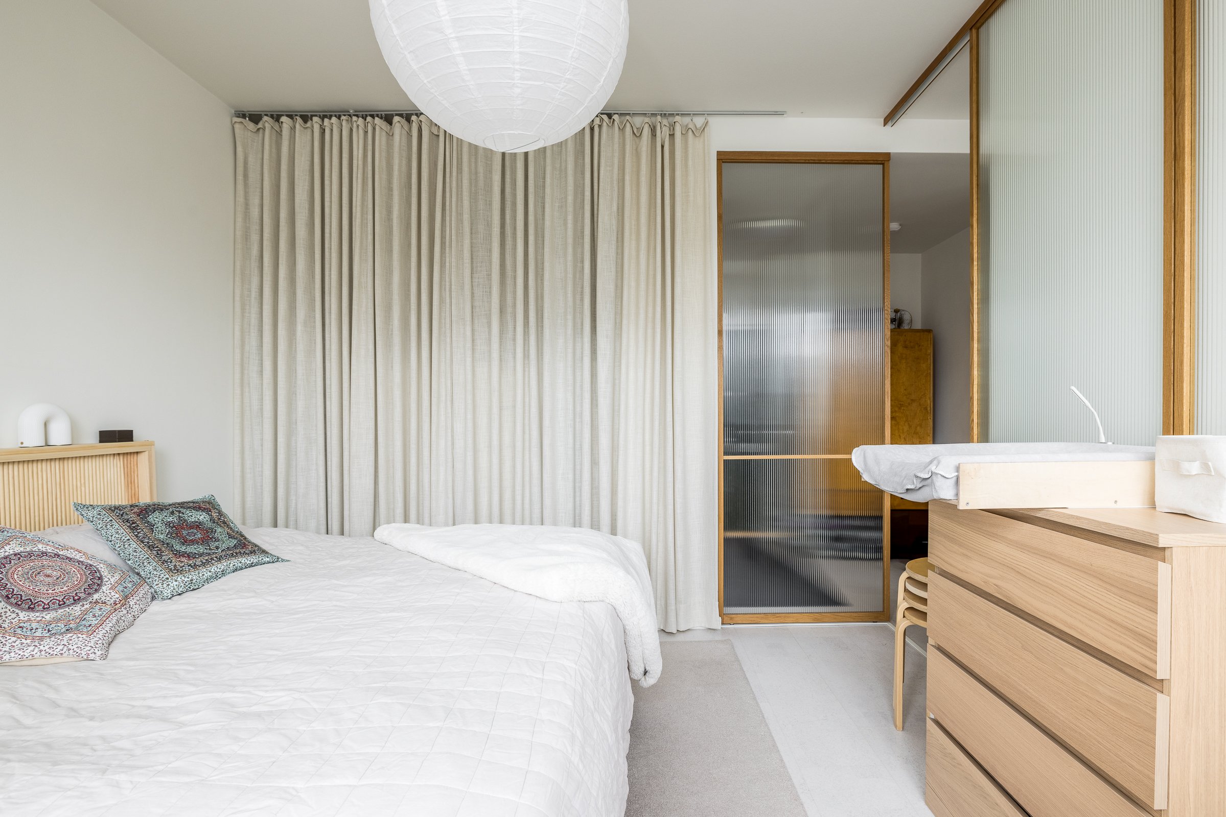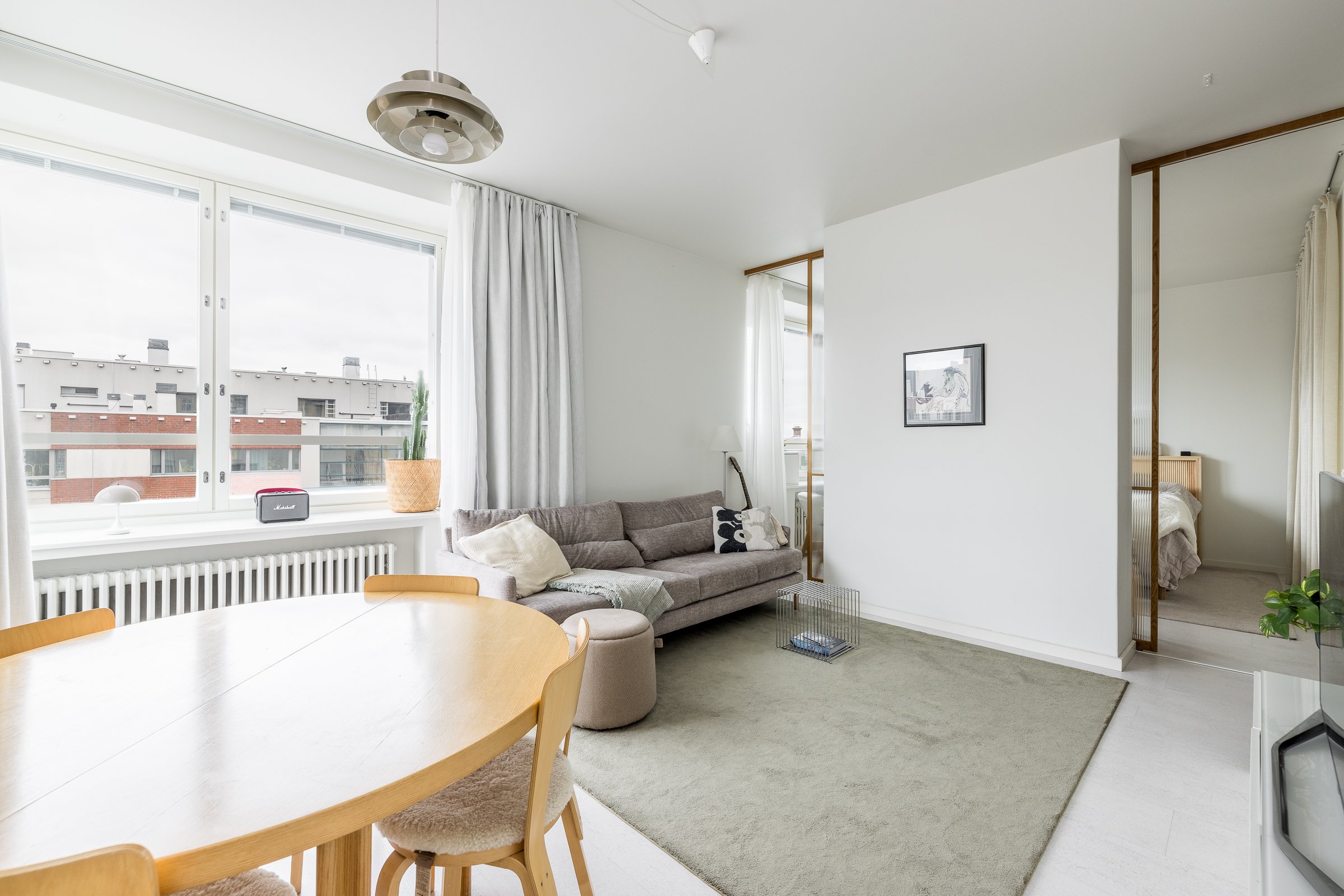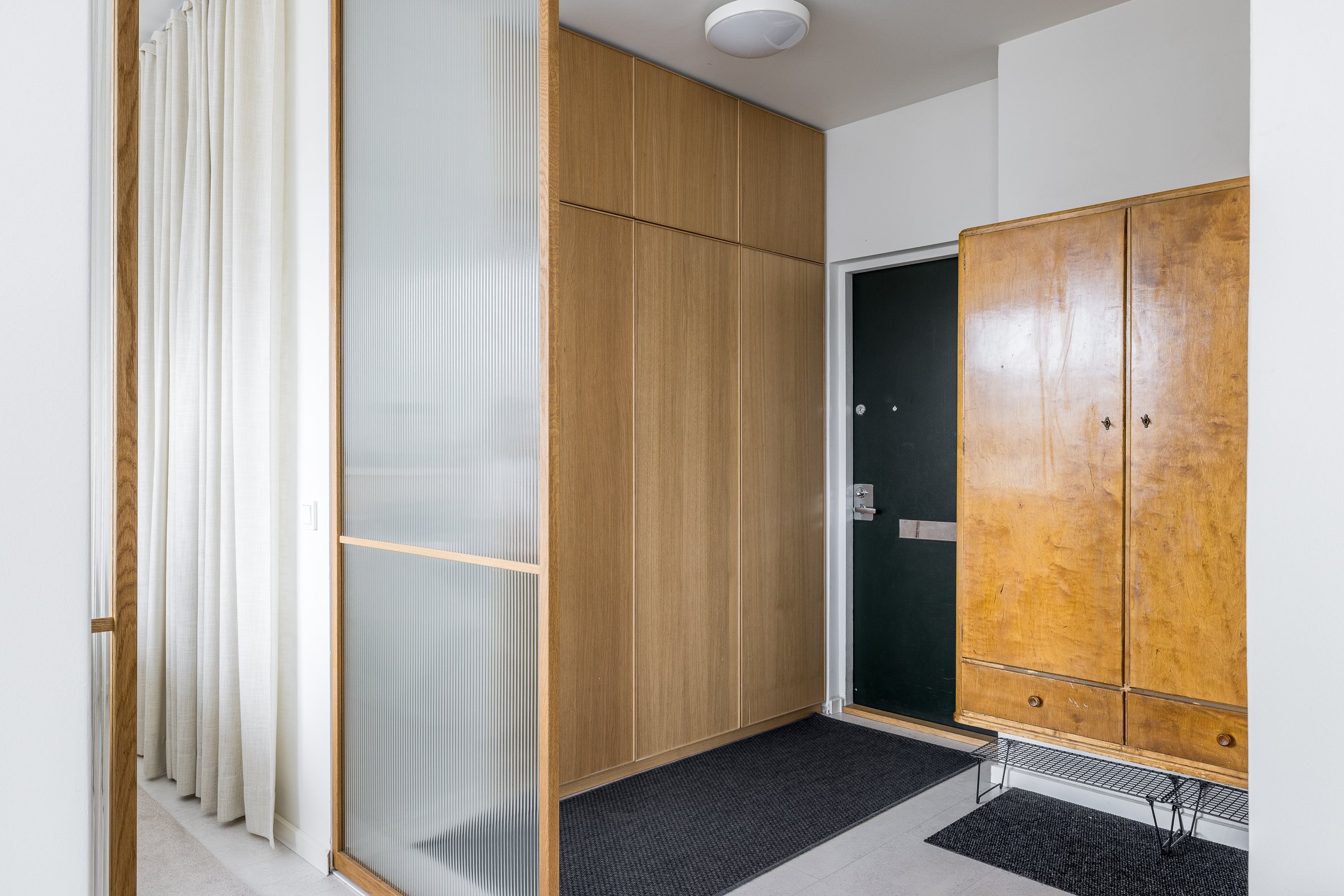 Makuuhuoneessa on hyvin tilaa työpisteelle tai lastensängylle. Olohuone ja makuuhuone on jaettu omiksi tiloikseen kauniilla tammikehyksellisillä liukuovilla. Huoneistoremontin lähtökohtana on ollut säilytystilan maksimointi. Eteisen, makuuhuoneen ja kylpyhuoneen säilytysjärjestelmät ulottuvat lattiasta kattoon. Yksityiskohtana mainittakoon jalalle lämmin ja akustisesti erinomainen koko asunnon kattava korkkilattia.