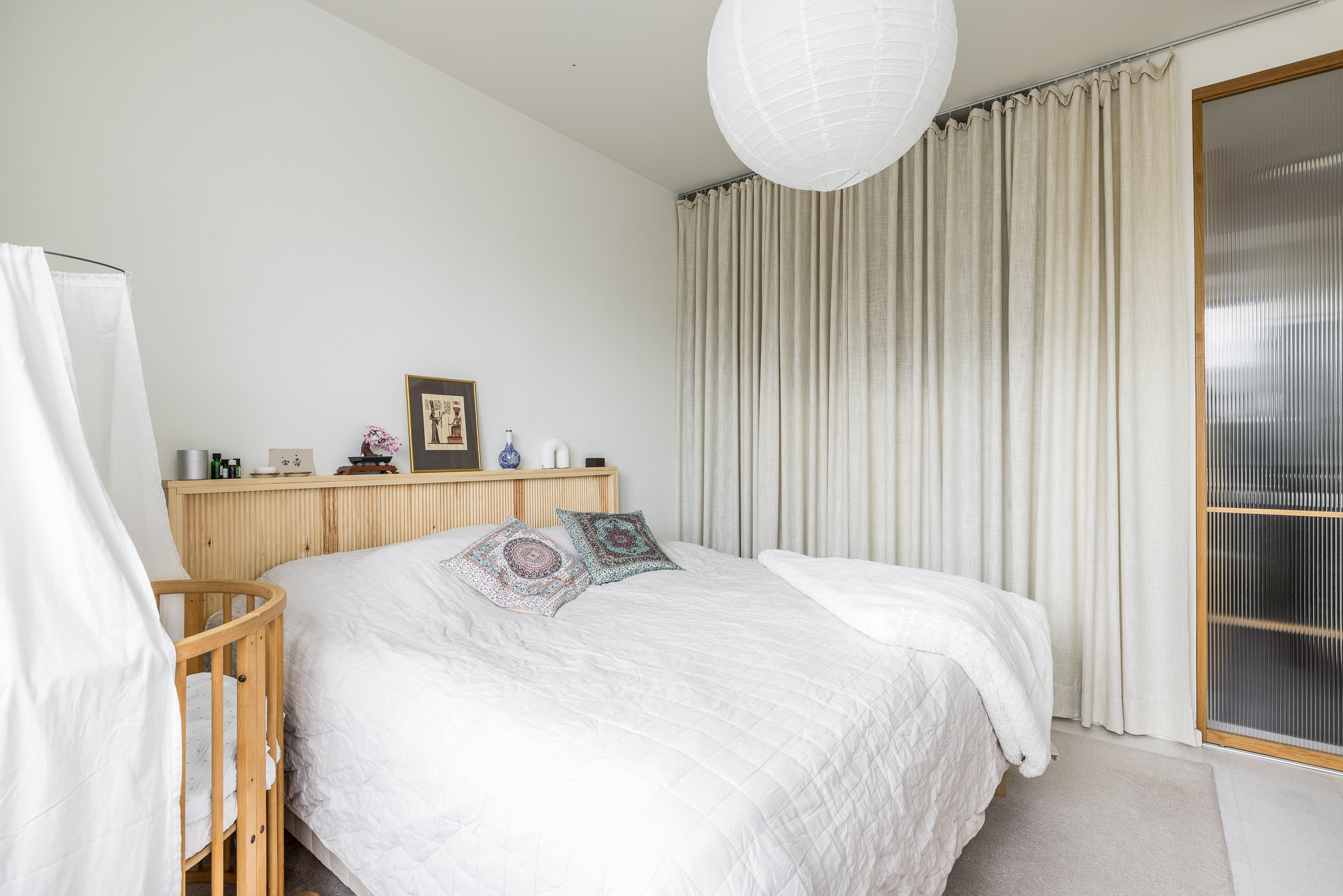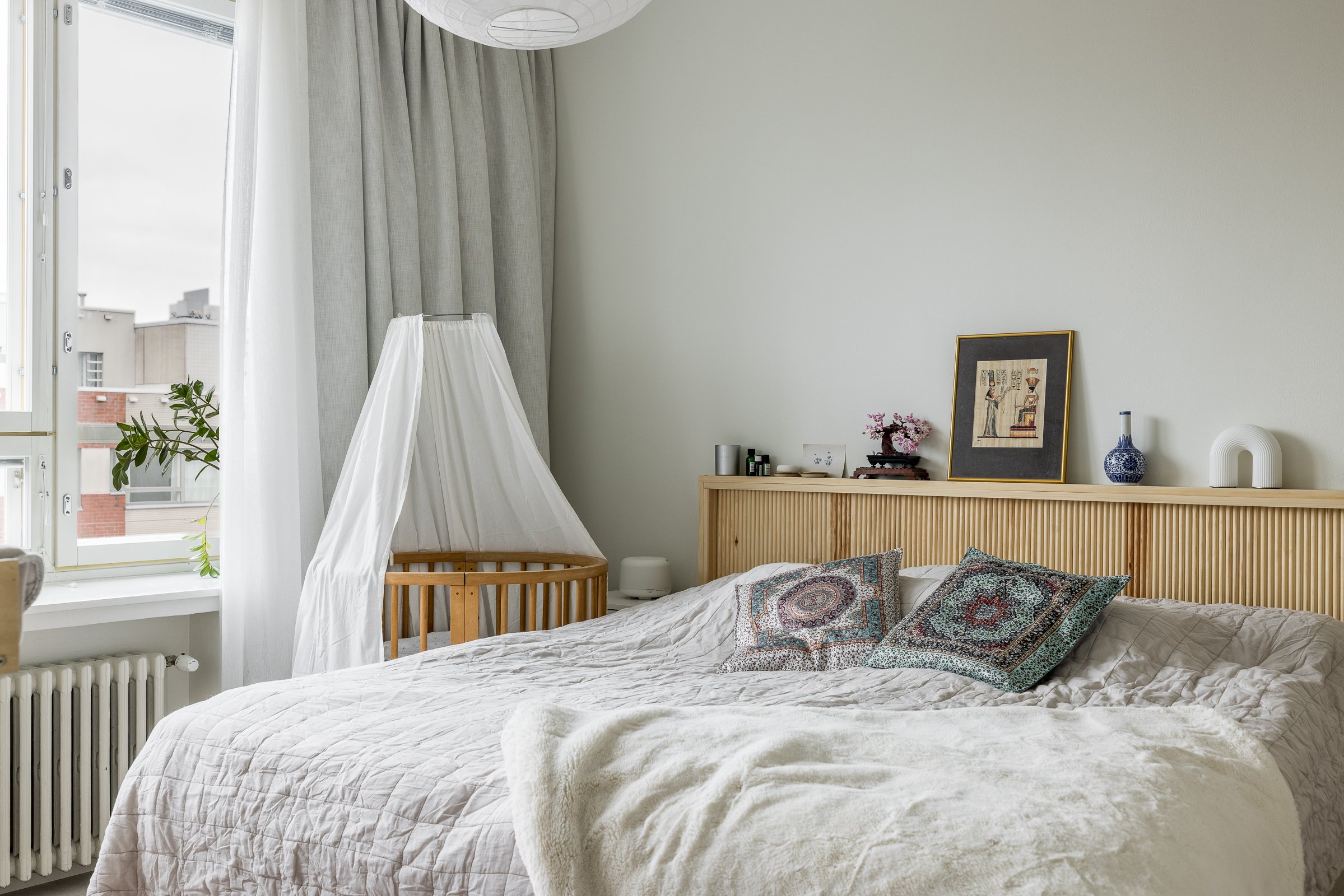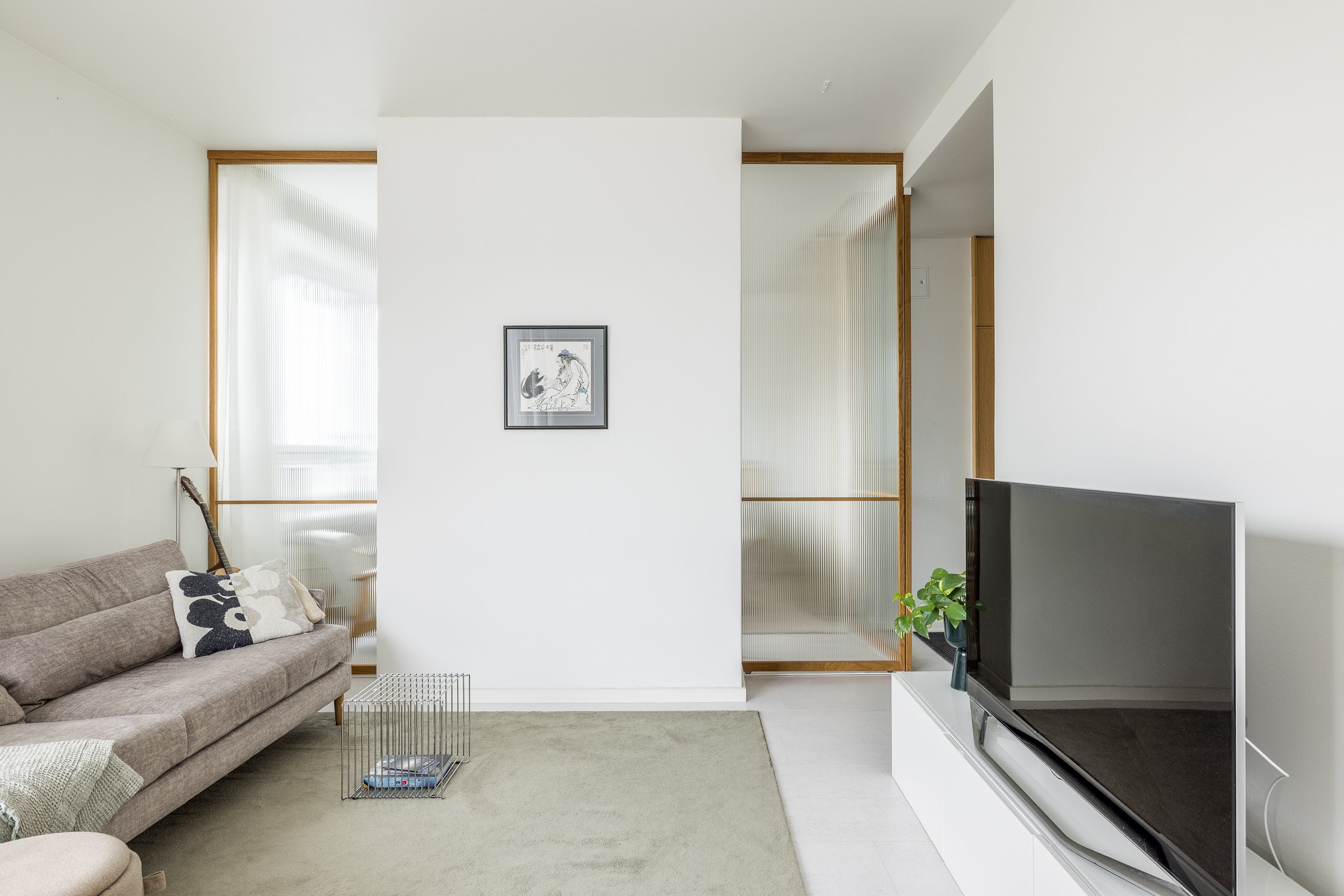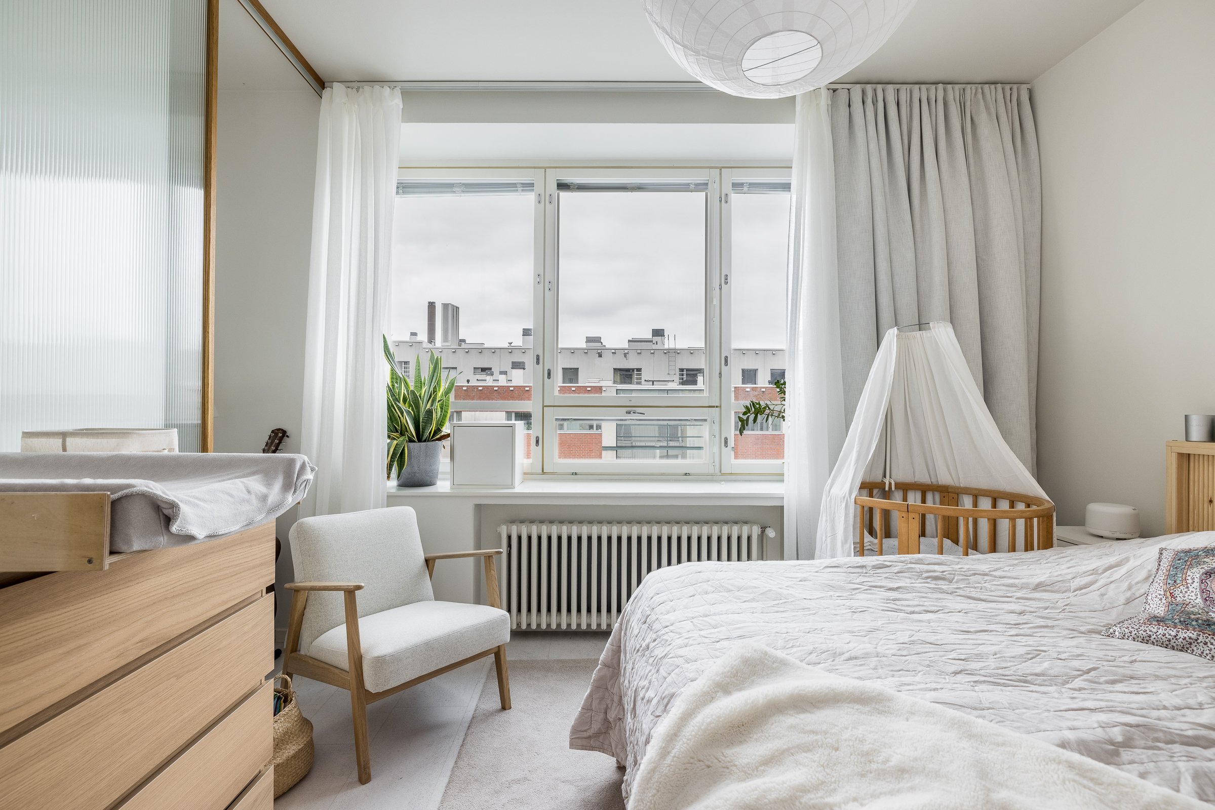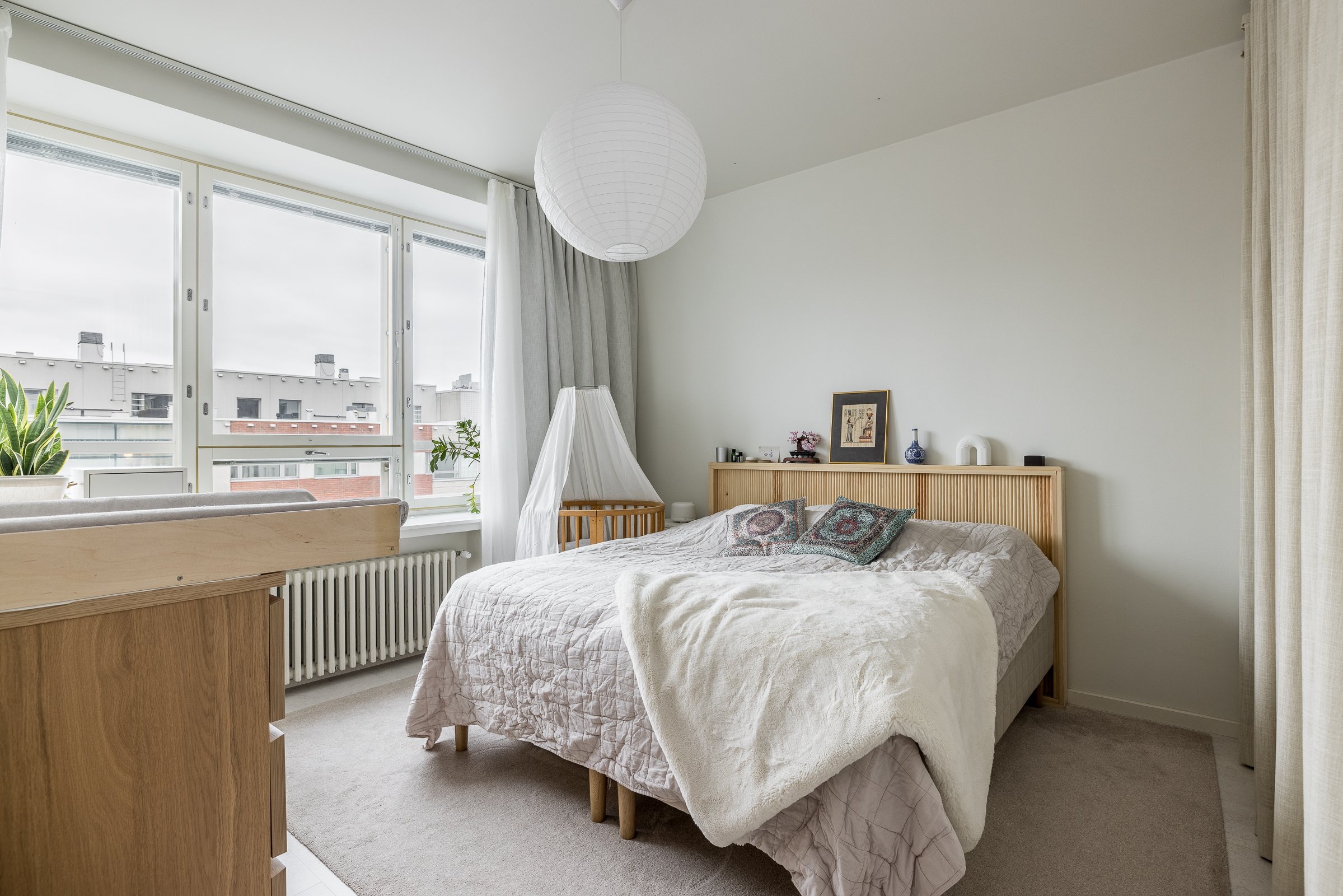 Makuuhuoneessa on hyvin tilaa työpisteelle tai lastensängylle. Olohuone ja makuuhuone on jaettu omiksi tiloikseen kauniilla tammikehyksellisillä liukuovilla. Huoneistoremontin lähtökohtana on ollut säilytystilan maksimointi. Eteisen, makuuhuoneen ja kylpyhuoneen säilytysjärjestelmät ulottuvat lattiasta kattoon. Yksityiskohtana mainittakoon jalalle lämmin ja akustisesti erinomainen koko asunnon kattava korkkilattia.