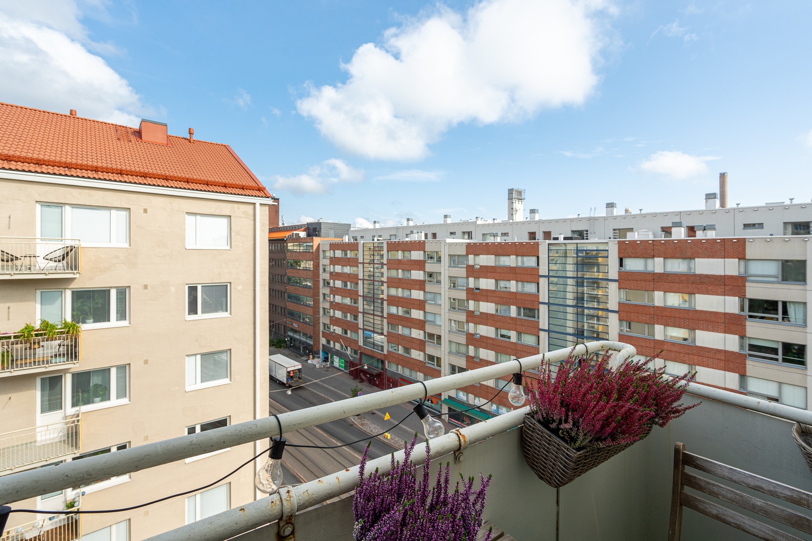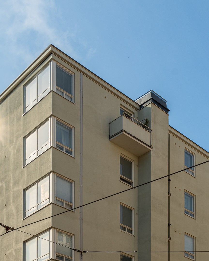 Funkkistalon ylimmän kerroksen kulmahuoneisto taloyhtiön ainoalla parvekkeella!