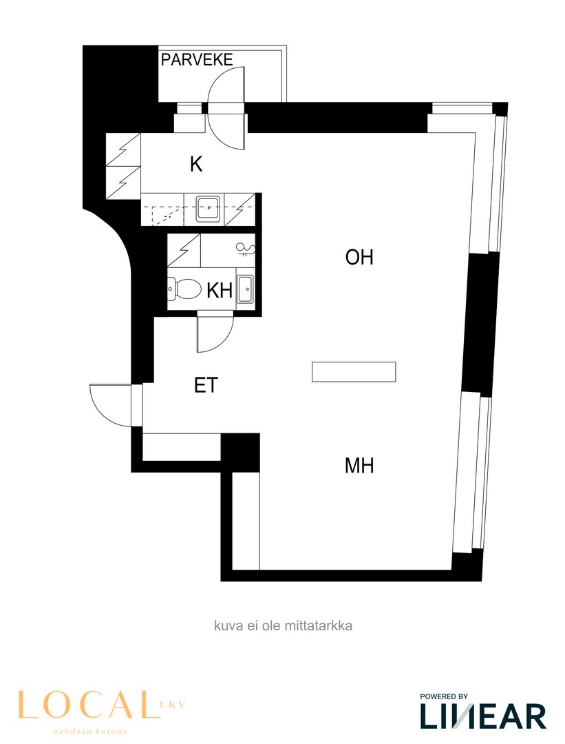 Huoneiston pinta-alaa ei ole mitattu SFS 5139 (rakennusten pinta-alat) määriteltyä huoneistoalan laskemismenetelmää käyttäen, huoneiston todellinen pinta-ala saattaa siis poiketa oleellisestikin yhtiöjärjestyksessä ilmoitetusta huoneiston pinta-alasta.