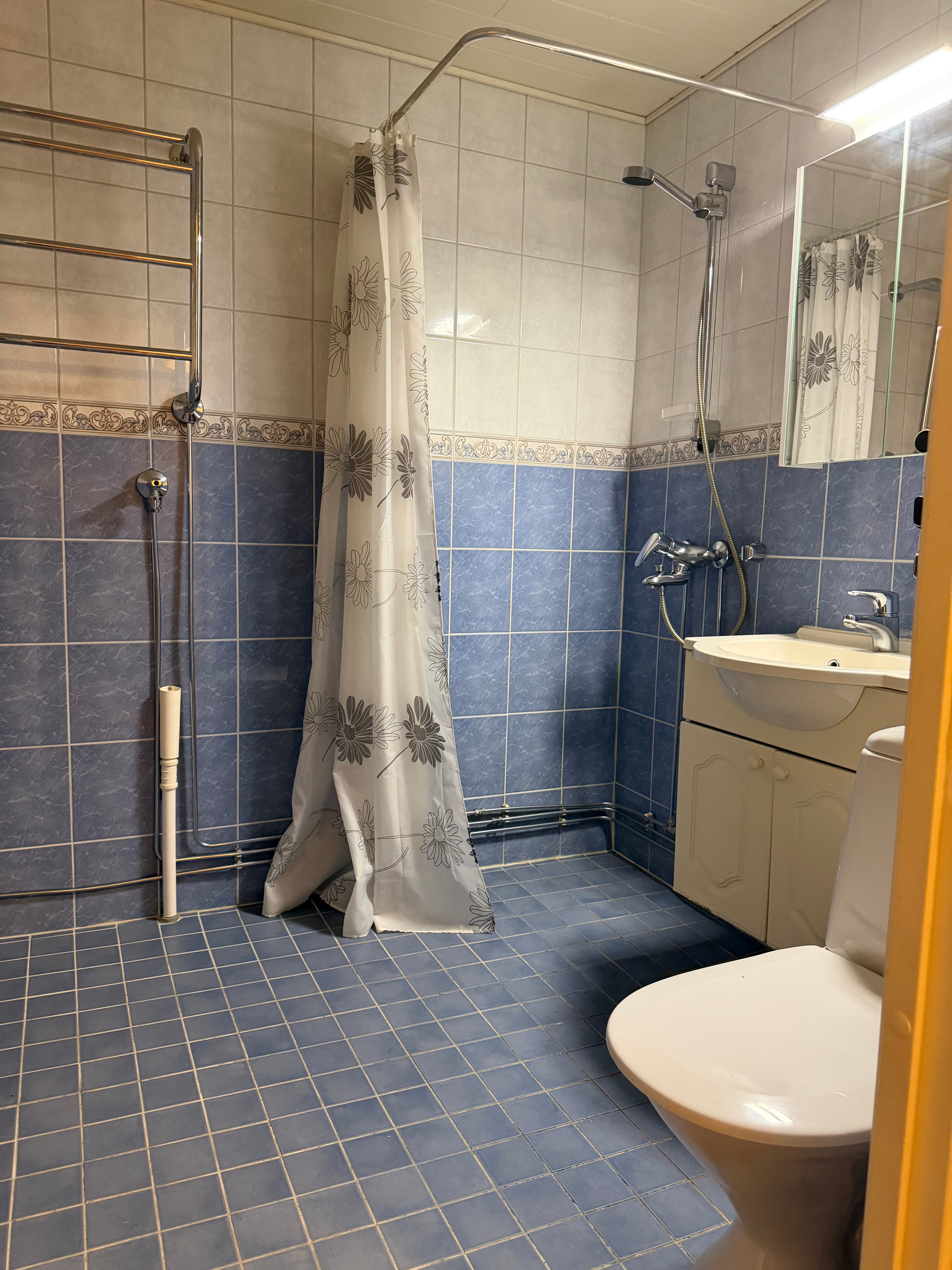 WC-istuin, suihku, pesukoneliitäntä, peili, bidee-suihku ja allaskaappi