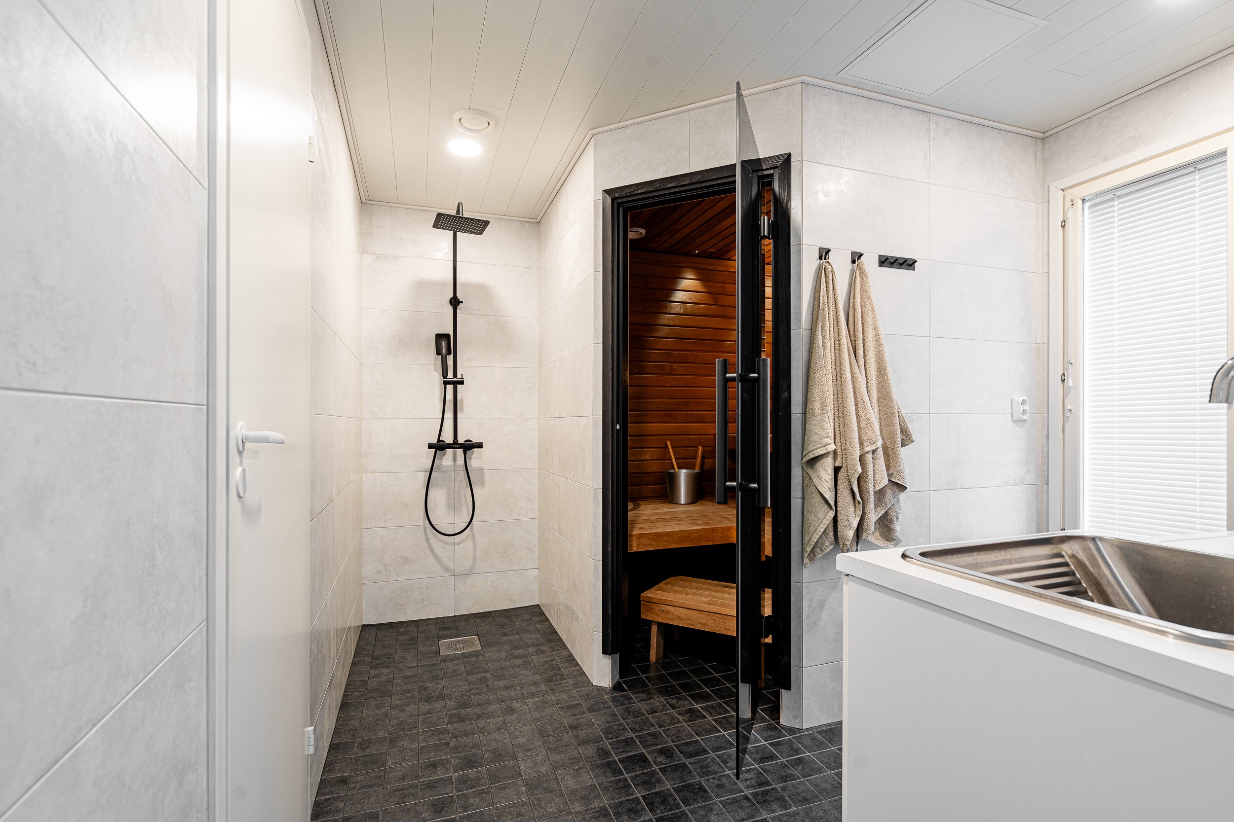 Alakerran käytännöllisiin tiloihin kuuluvat keittiön liäksi saunaosasto, kodinhoitohuone sekä erillinen wc. Vuonna 2021 kaikki märkätilat – sauna, suihkut, wc:t ja kodinhoitohuone – uusittiin kokonaan, jolloin ne saivat modernin ilmeen ja laadukkaat kalusteet.