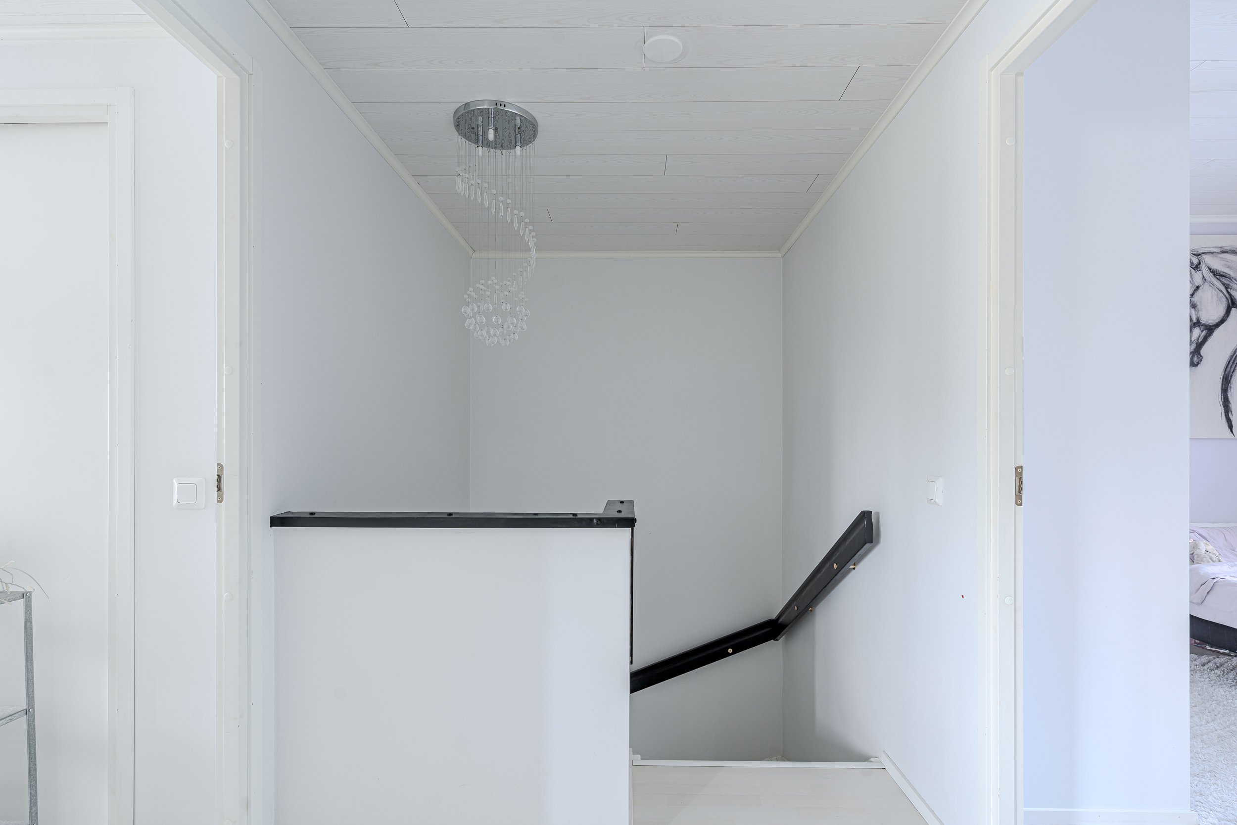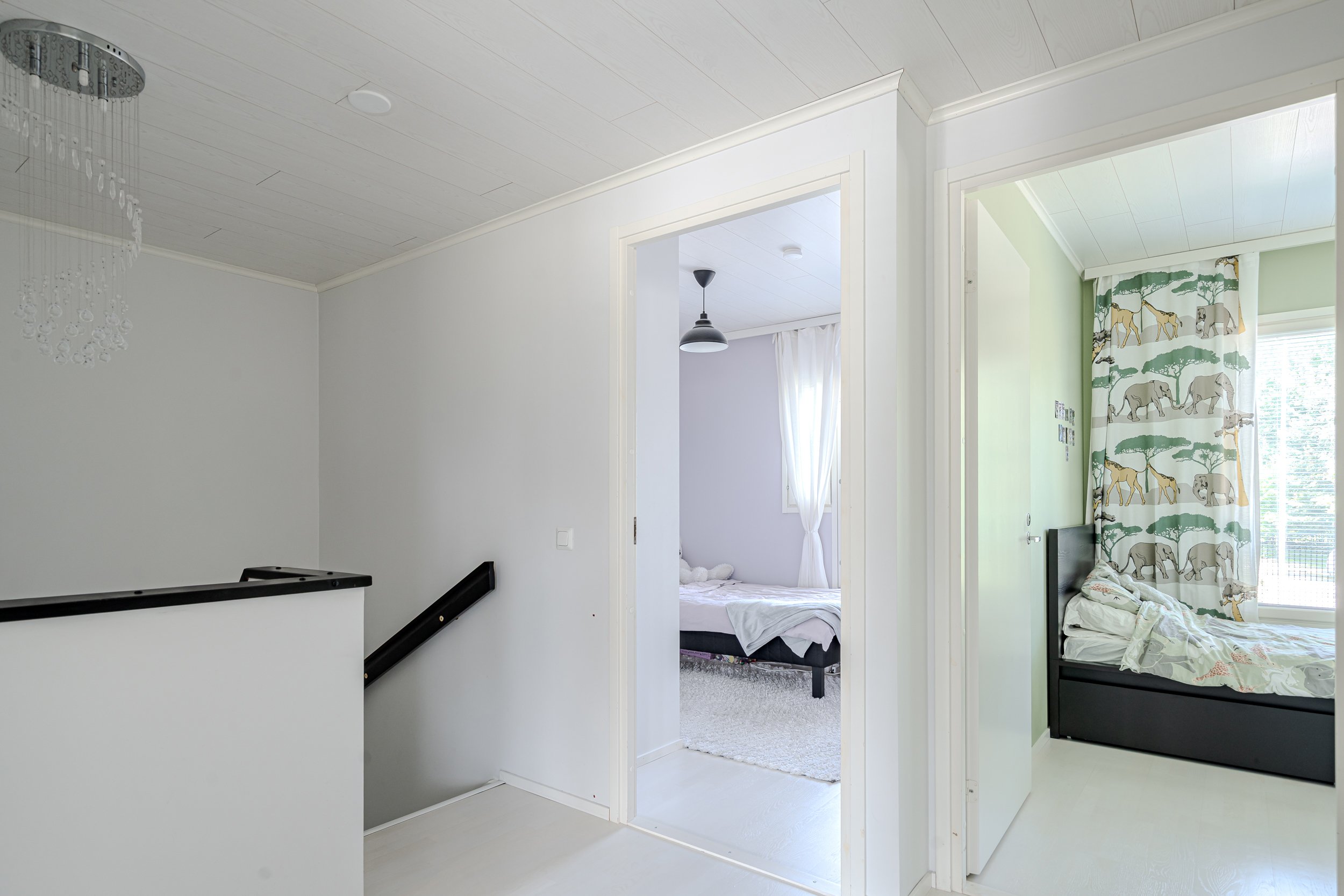 Yläkerrassa neljä makuuhuonetta. Lattiat parkettia, seinät maalattu.