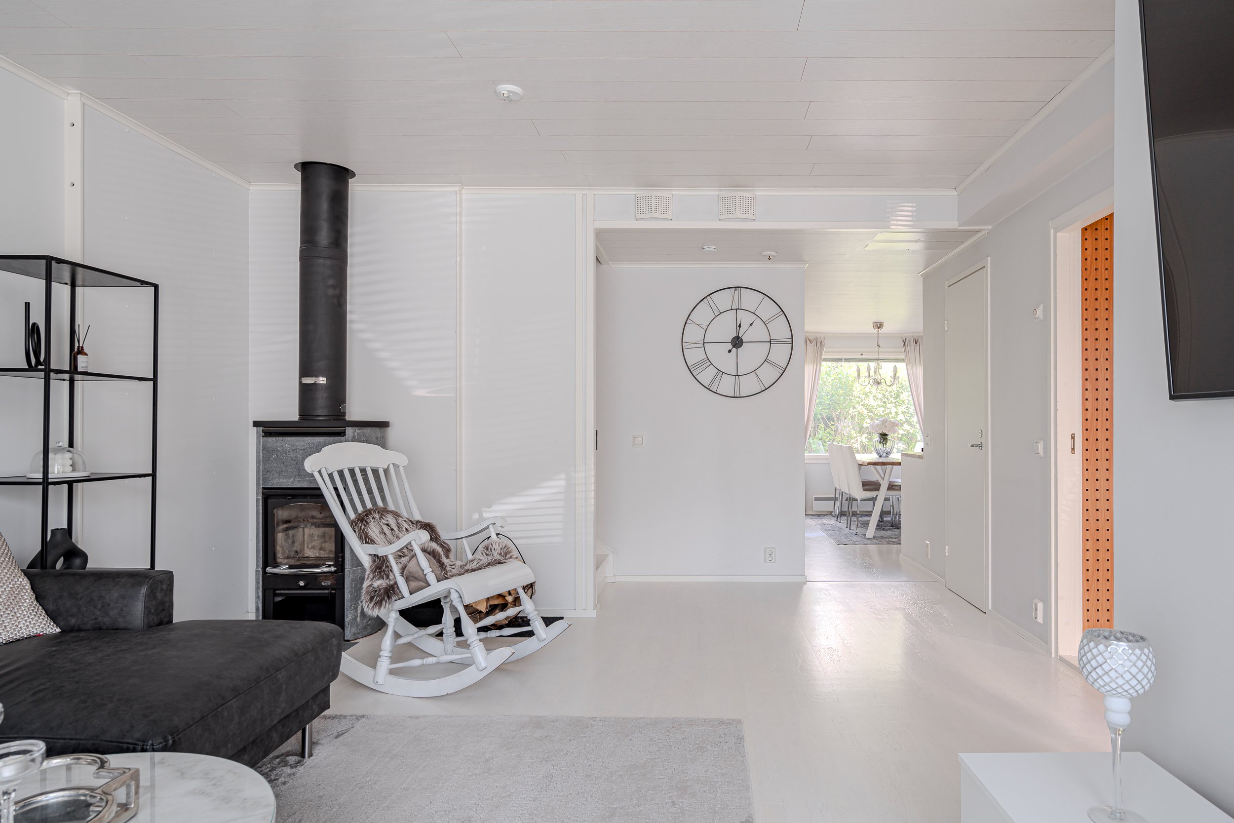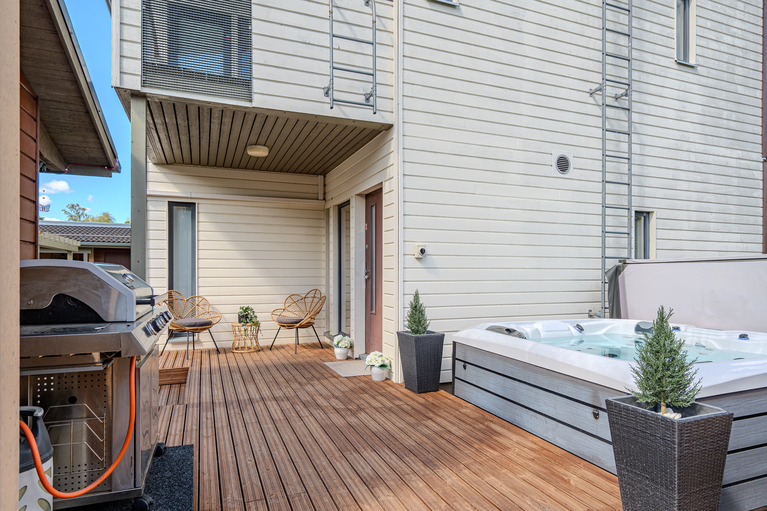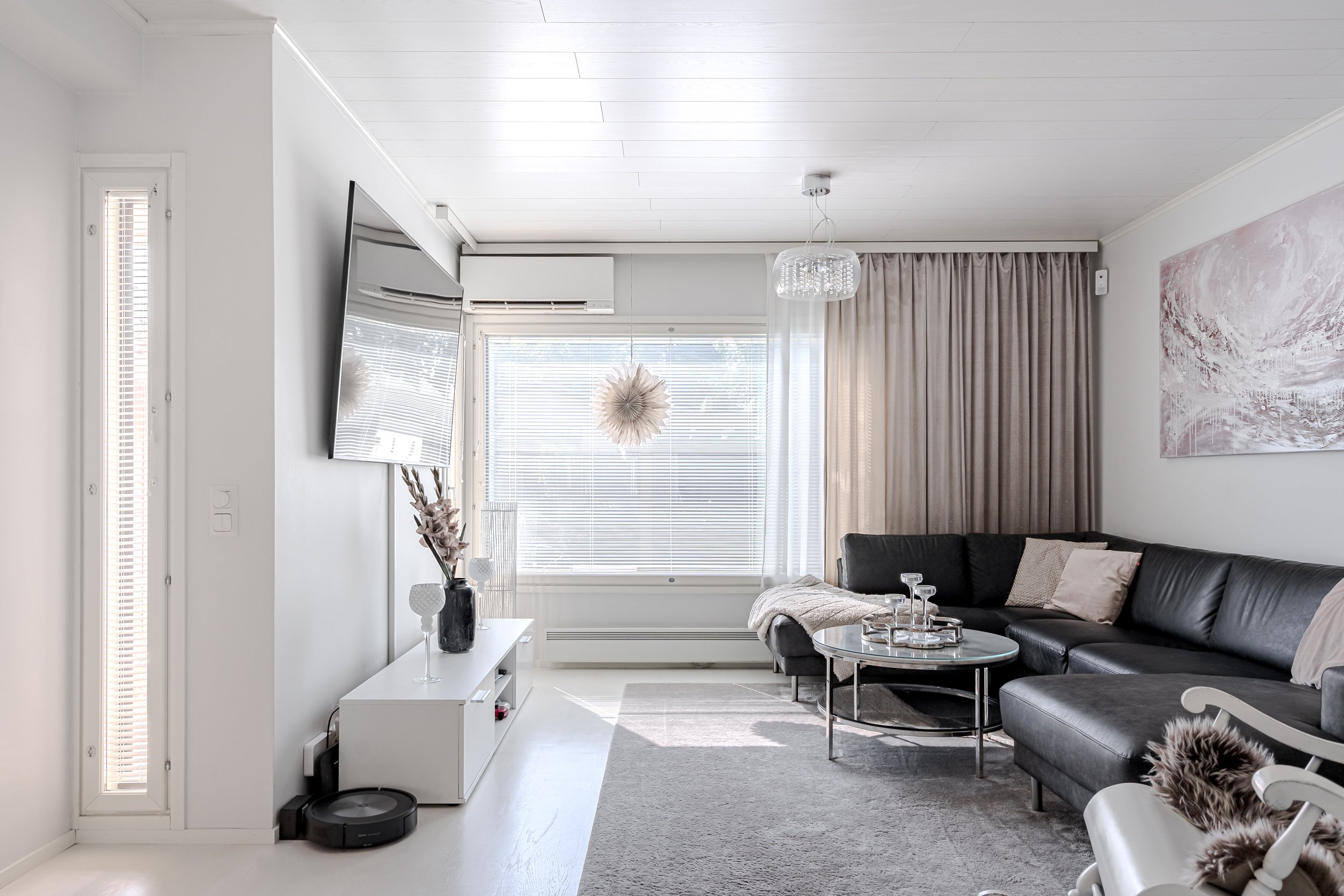 Asunnon eteisestä aukeaa avara olohuone josta löytyy kaunis takka, joka luo tunnelmaa talven kylmiin ja pimeisiin hetkiin. Valoisasta olohuoneesta on käynti hulppealle terassille joka on saanut täysin uuden ilmeen muutama vuosi takaperin. Etupihan kivetys on uusittu ja etupihaa muokattu niin, että saat nykyään auton suoraan oven eteen. Terassi on niin ikään uusittu runkoa ja pohjia myöten. Samalla terassin kokoa laajennettin ja siihen asennettiin Jakuzzi.